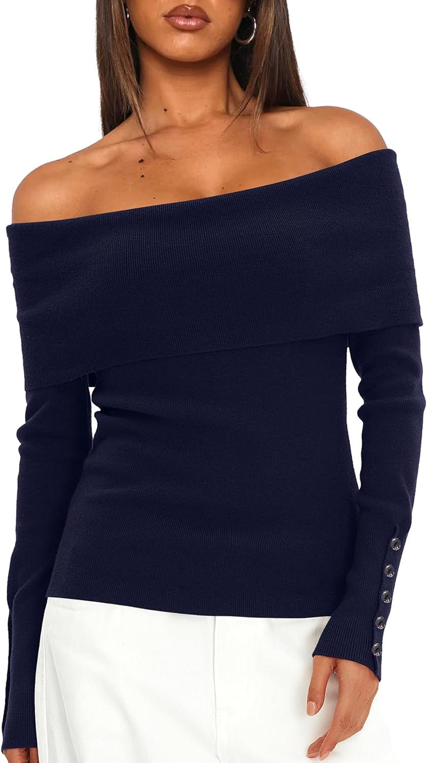 Discover the latest Daong Off The Shoulder Sweater for Women 2025 Fall Fashion Cute Going Out Y2k Tops Ribbed Pullover Knit Sweaters(Dark Blue) from and take advantage of our limited-time introductory offer.
