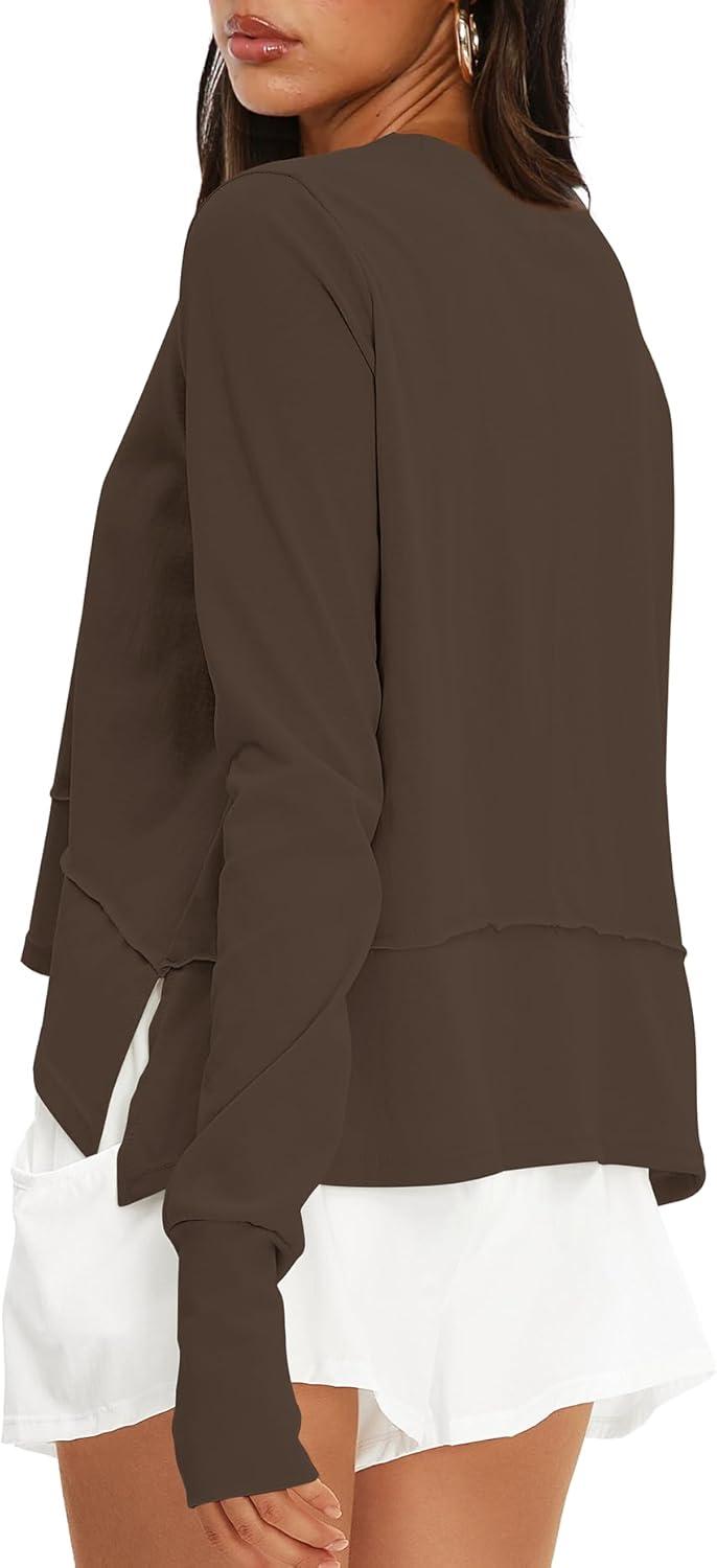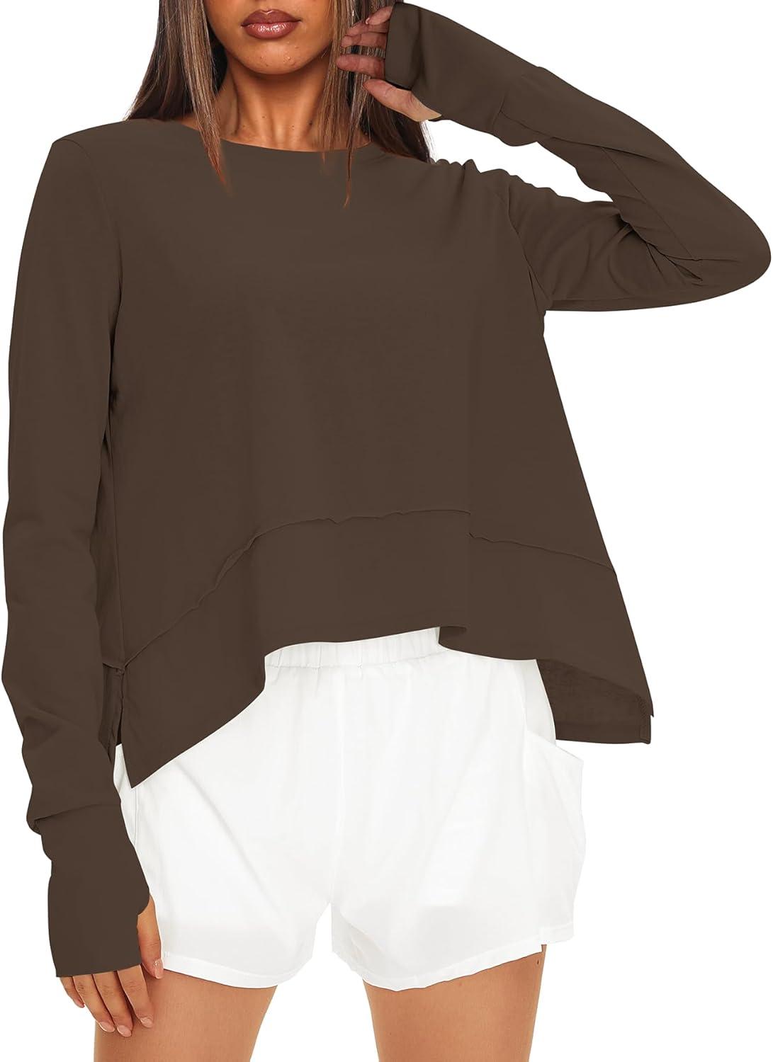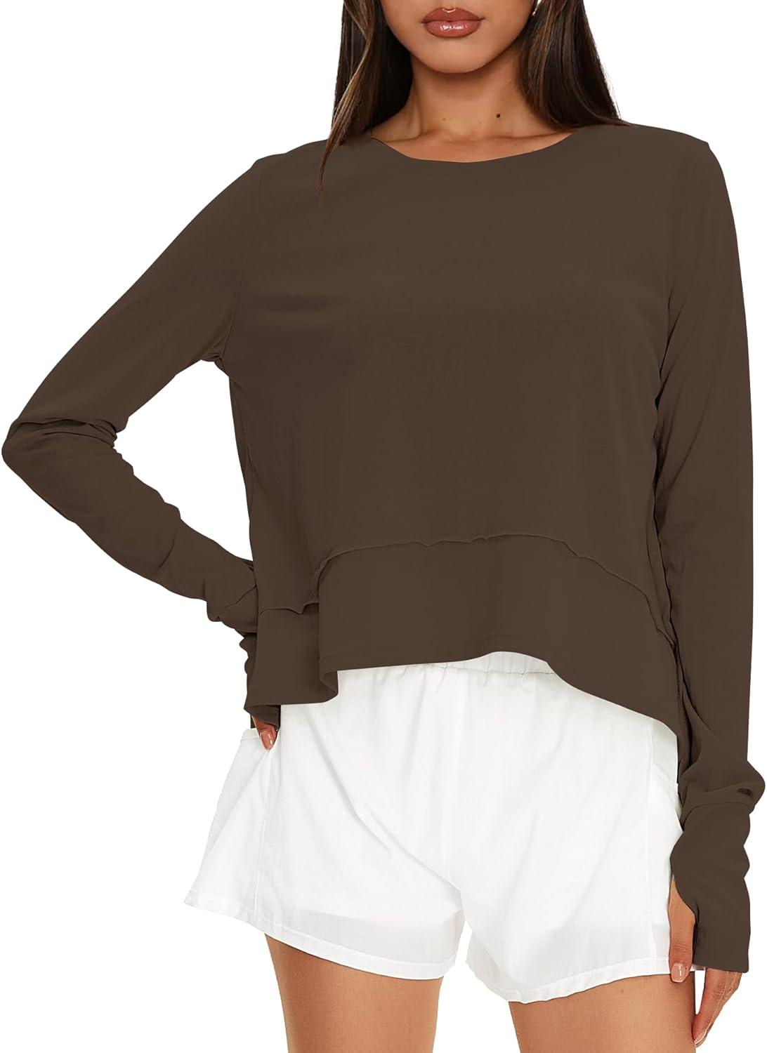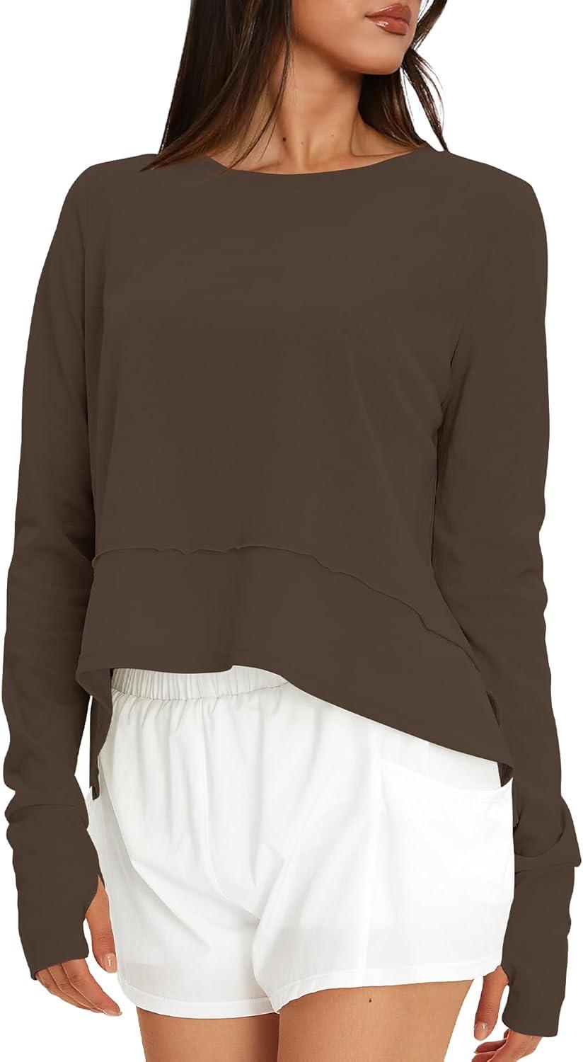 Darong Cotton Long Sleeve Workout Shirts for Women Loose Fit Athletic Yoga T-Shirts Casual Slouchy Crop Running Tees(Brown)