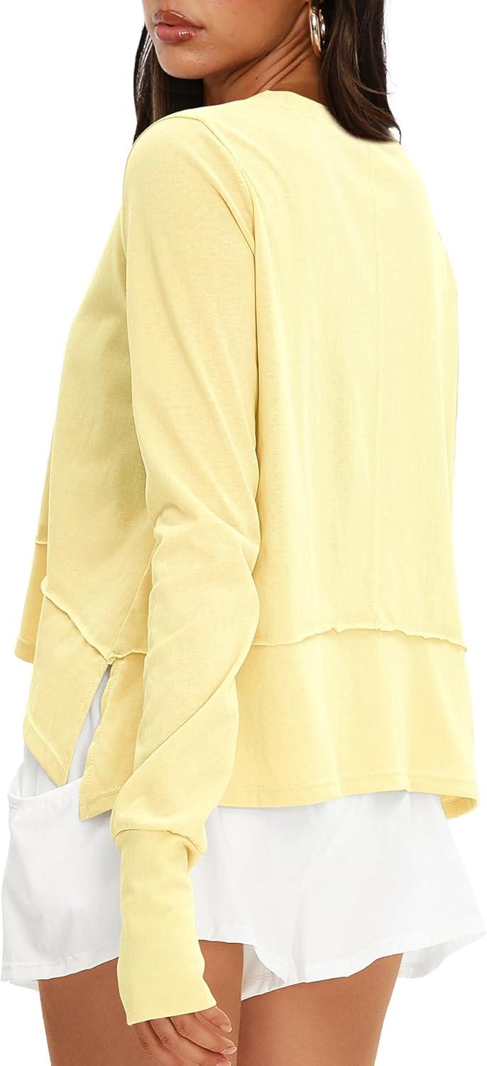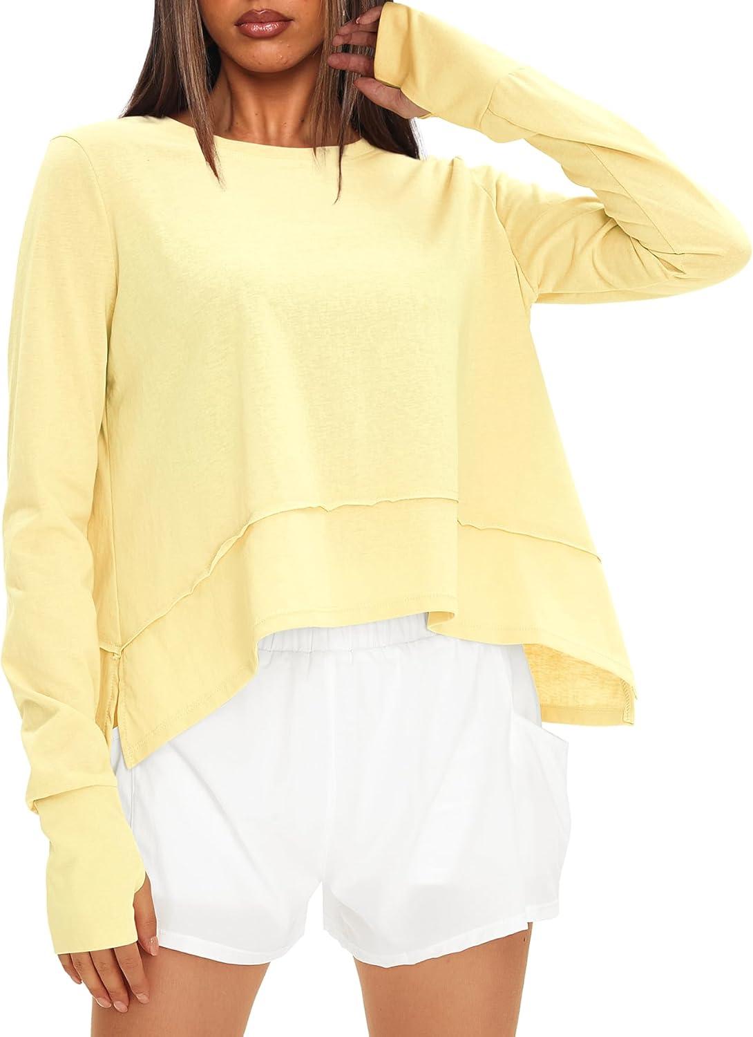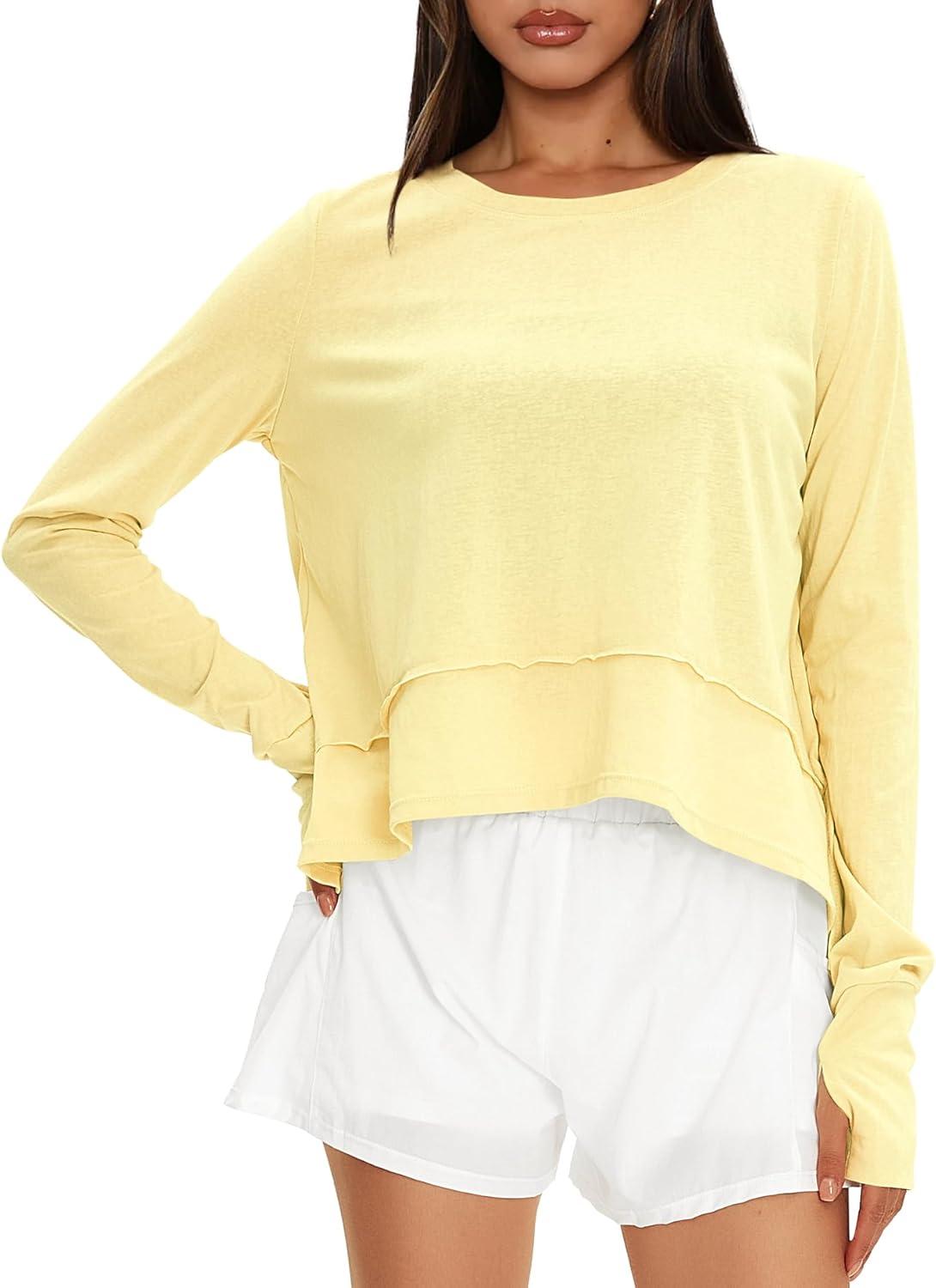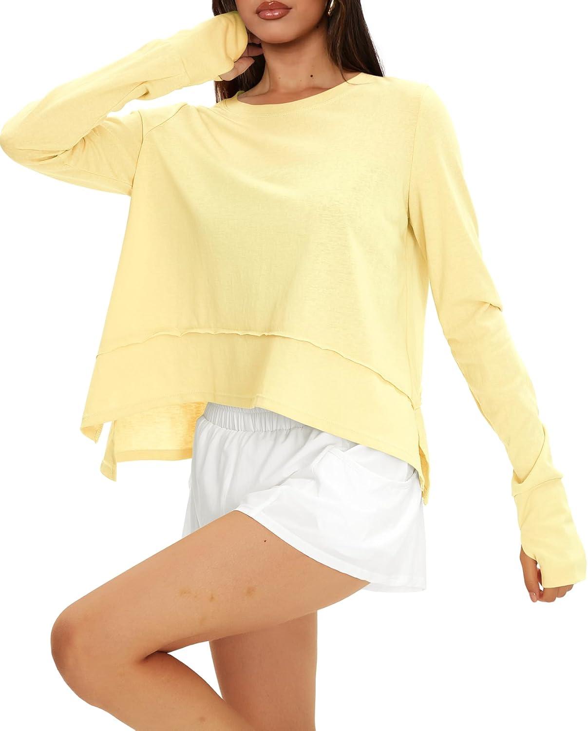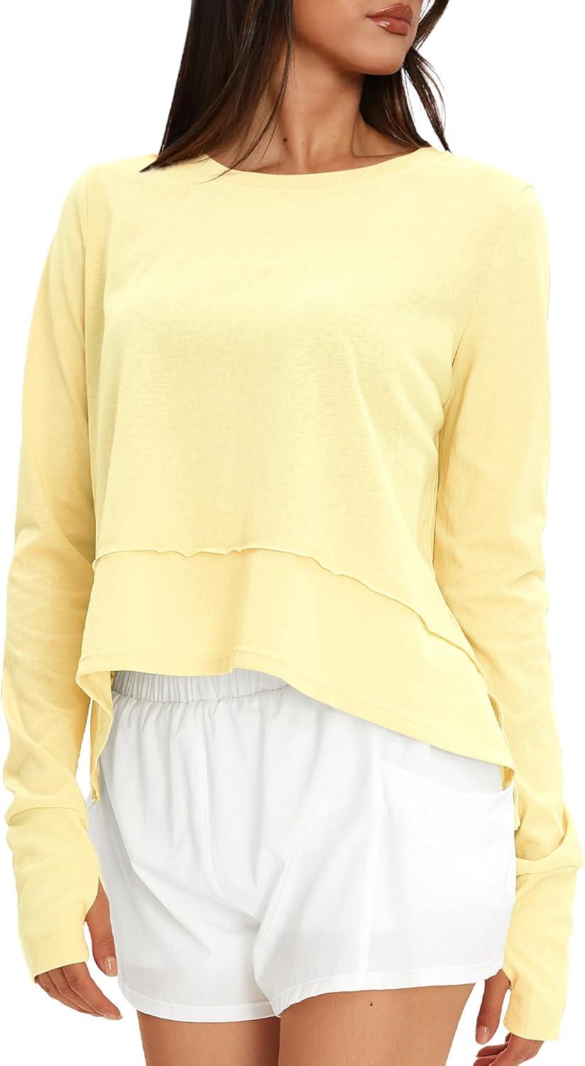 Darong Cotton Long Sleeve Workout Shirts for Women Loose Fit Athletic Yoga T-Shirts Casual Slouchy Crop Running Tees(Light Yellow)