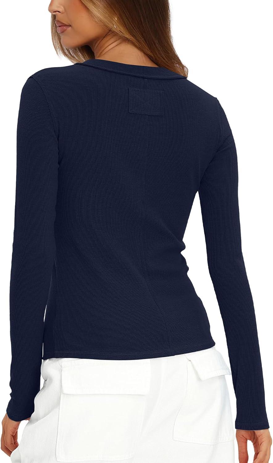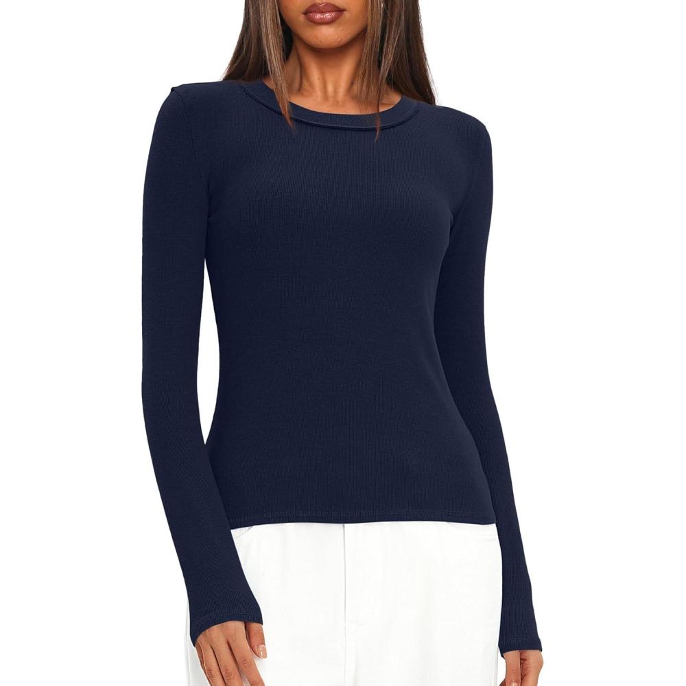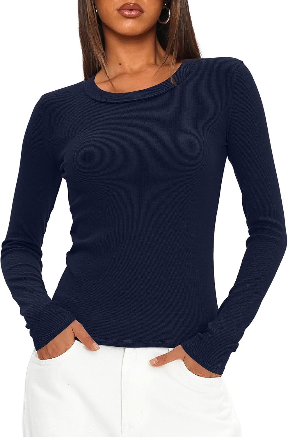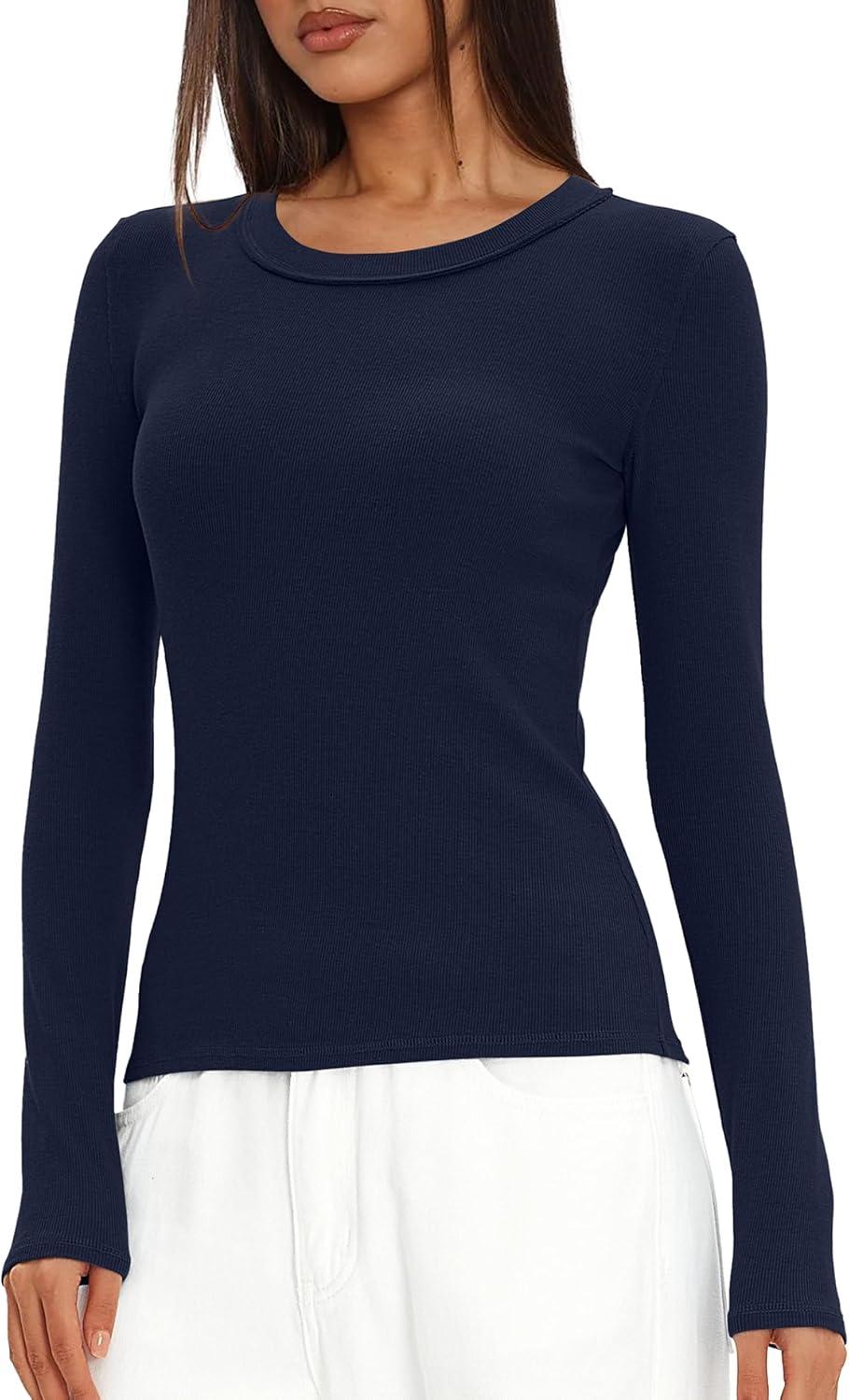 Darong Long Sleeve Shirts for Women Fall Fashion Crew Neck Basics Crop Tops Slim Fitted Y2K Tops Ribbed Outfits Clothes(Dark Blue)