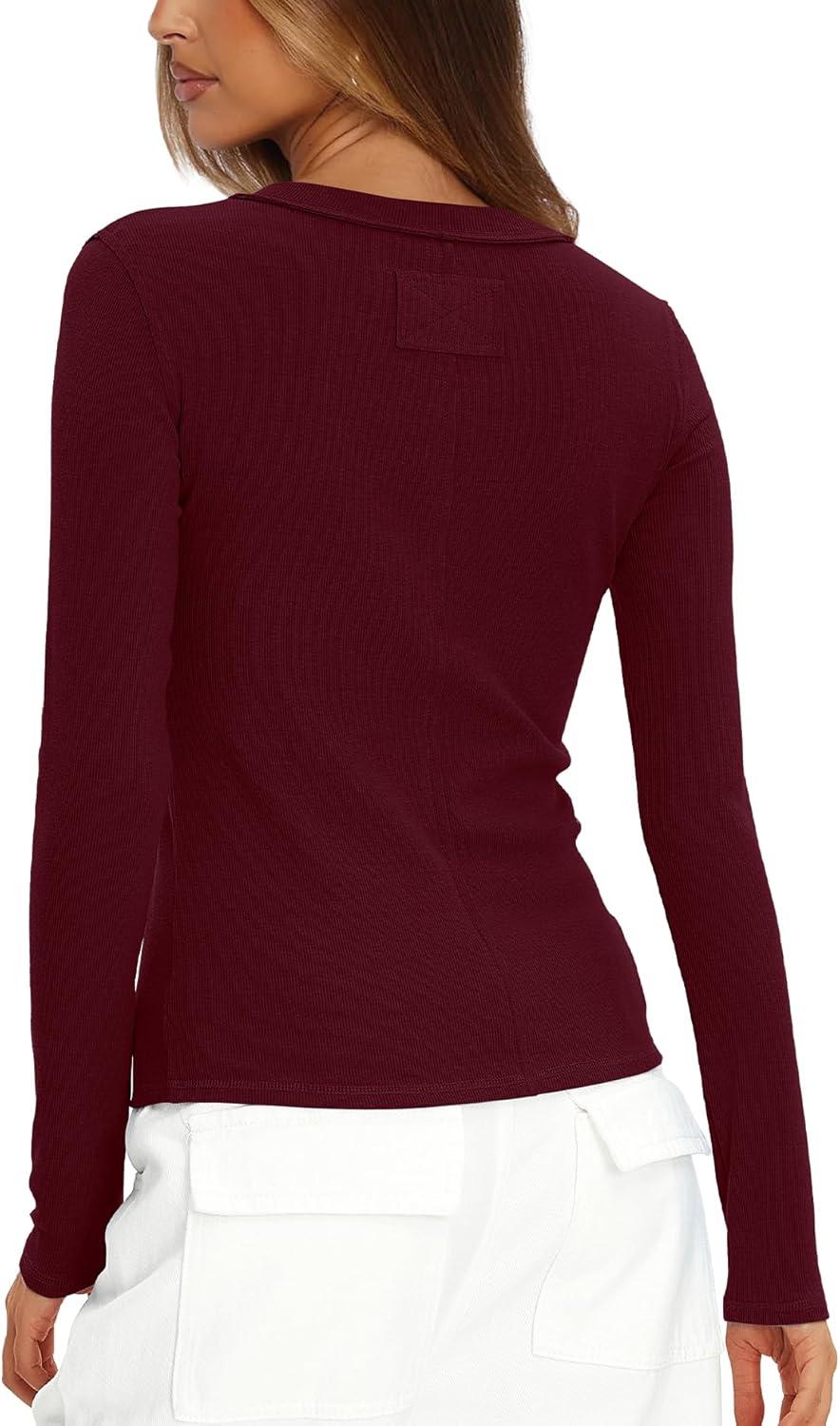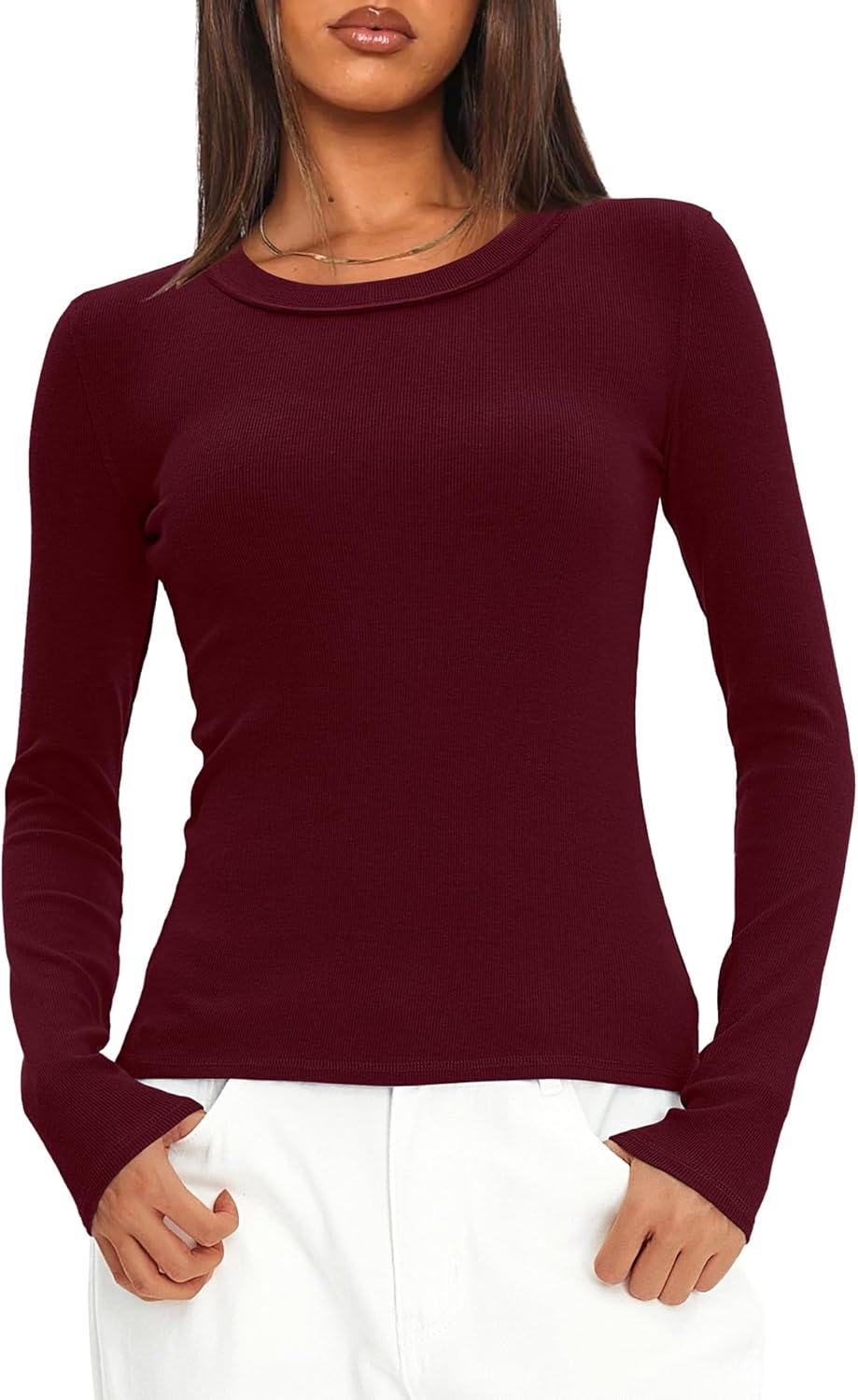 Darong Long Sleeve Shirts for Women Fall Fashion Crew Neck Basics Crop Tops Slim Fitted Y2K Tops Ribbed Outfits Clothes(Red)