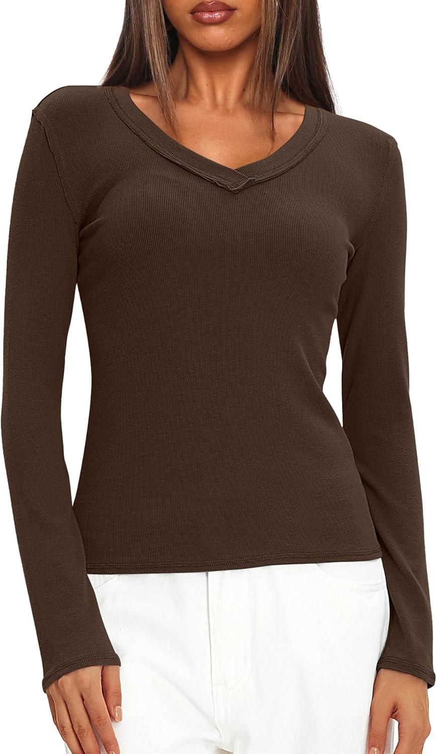 Darong Long Sleeve Tshirts for Women Fall Fashion V Neck Basics Crop Tops Slim Fitted Y2K Tops Ribbed Outfits Clothes(Coffee)