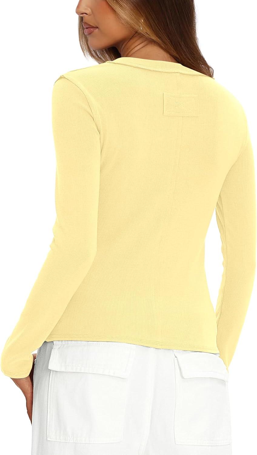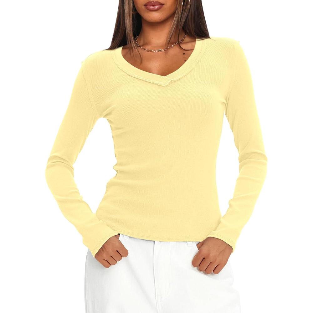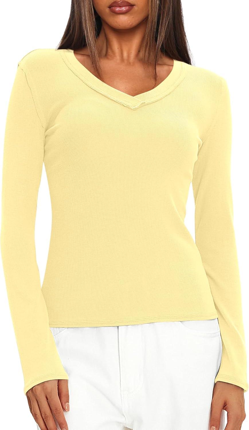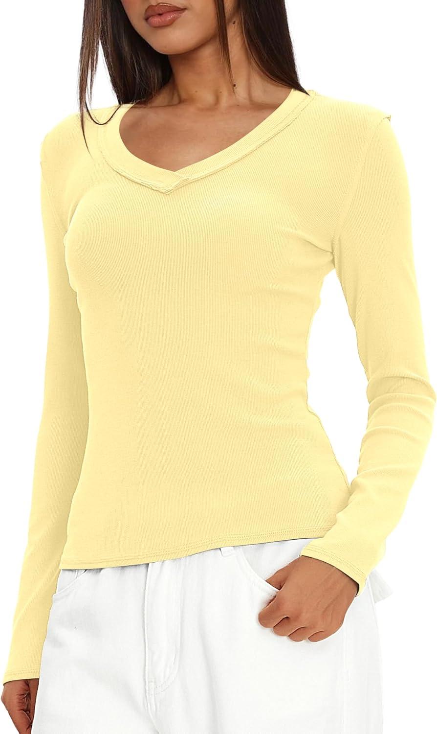 Darong Long Sleeve Tshirts for Women Fall Fashion V Neck Basics Crop Tops Slim Fitted Y2K Tops Ribbed Outfits Clothes(Light Yellow)