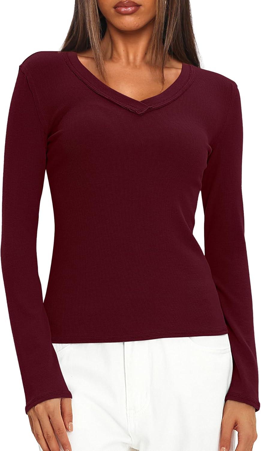 Darong Long Sleeve Tshirts for Women Fall Fashion V Neck Basics Crop Tops Slim Fitted Y2K Tops Ribbed Outfits Clothes(Red)