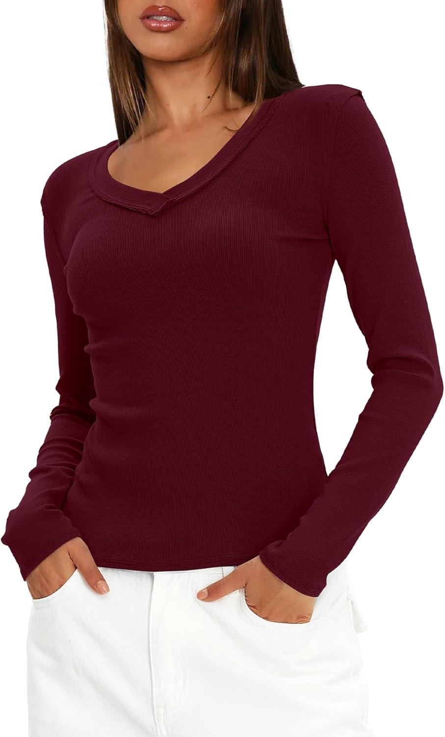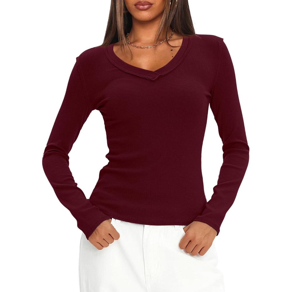 imageDarong Long Sleeve Tshirts for Women Fall Fashion V Neck Basics Crop Tops Slim Fitted Y2K Tops Ribbed Outfits ClothesRed