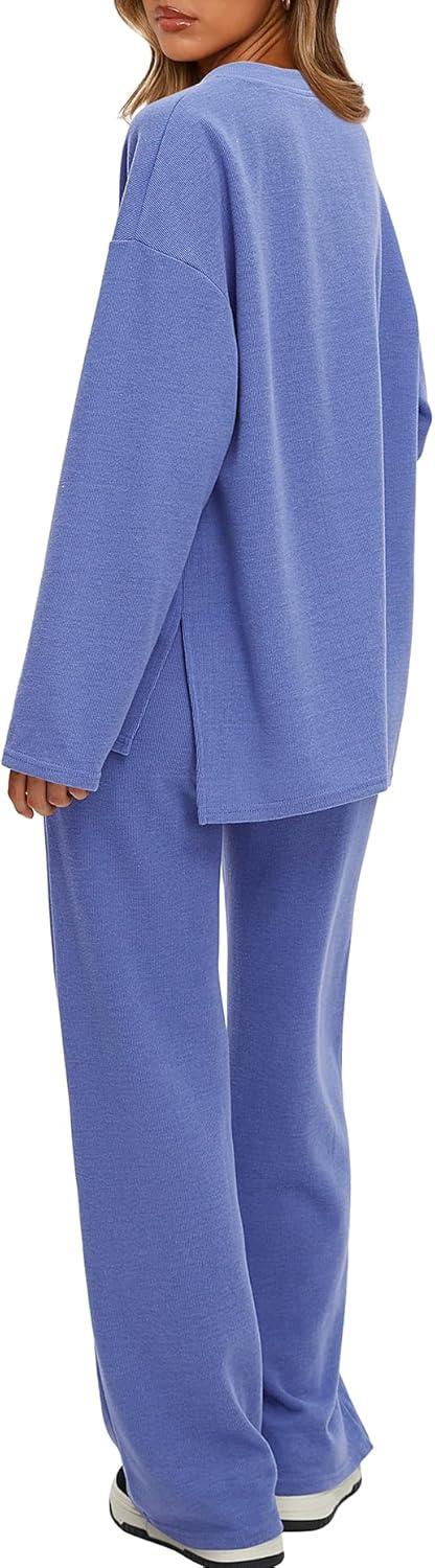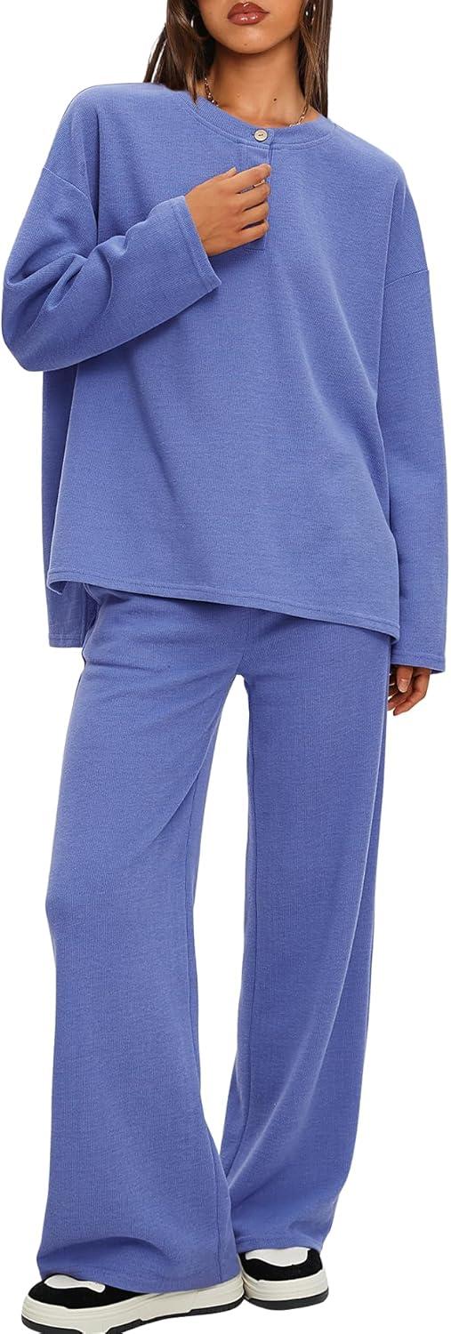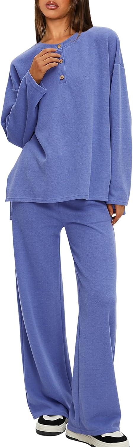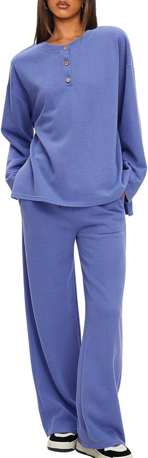 Darong Two Piece Outfits for Women Fall Lounge Sets Button Down Sweatshirt Wide Leg Pants Sweatsuits Set with Pockets(Blue)