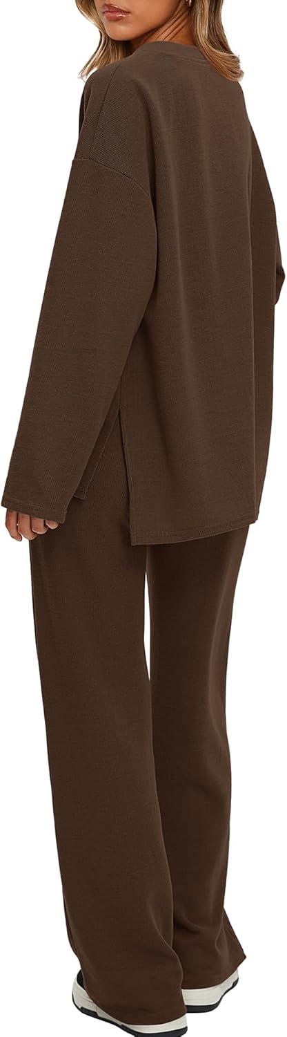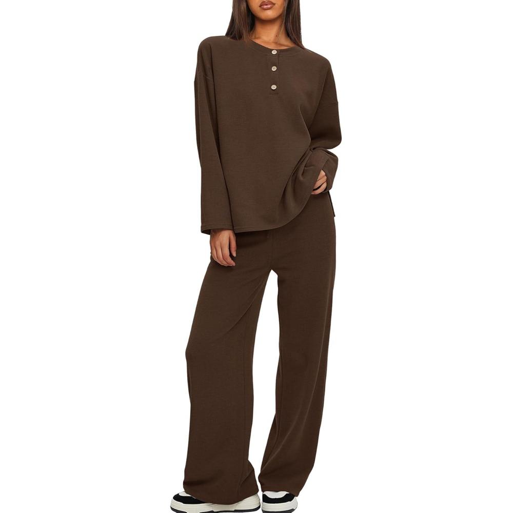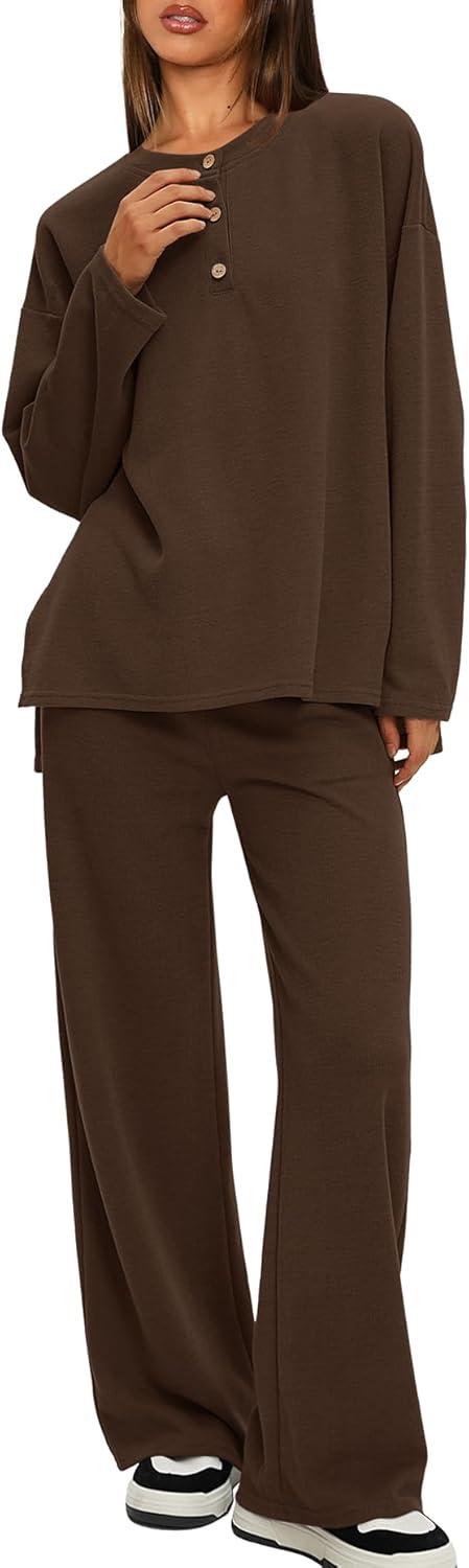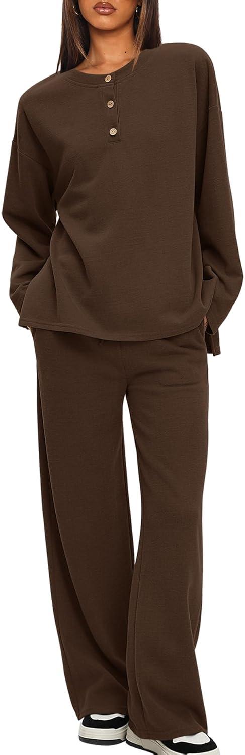 Darong Two Piece Outfits for Women Fall Lounge Sets Button Down Sweatshirt Wide Leg Pants Sweatsuits Set with Pockets(Coffee)