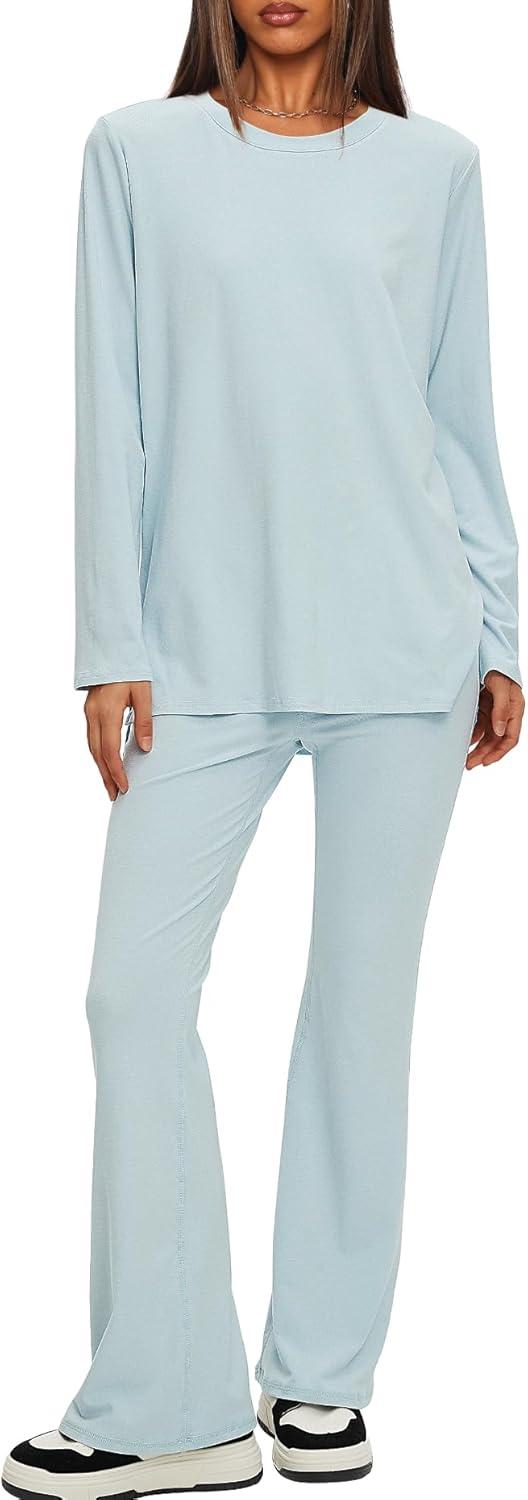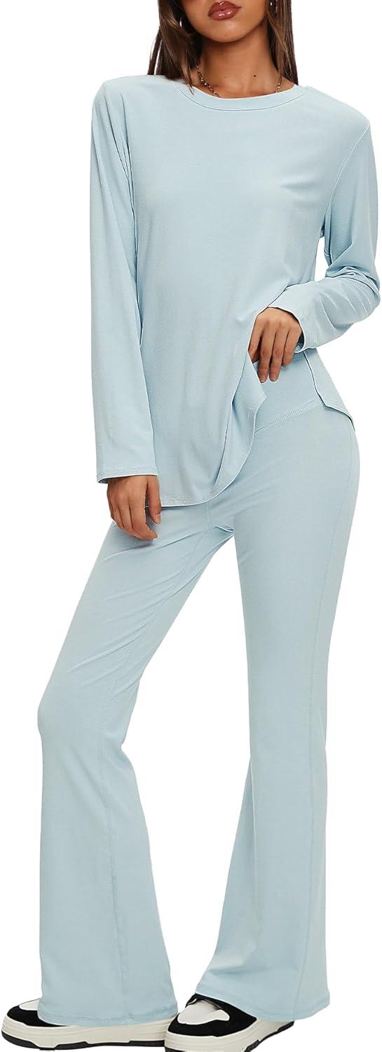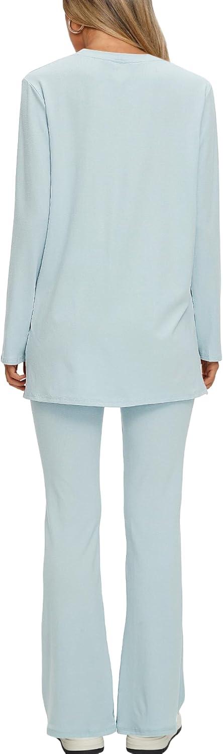 Darong Women 2 Piece Set Fall Outfit Cross Waist Flare Pants Long Sleeve Tunic Top Matching Lounge Set Travel Outfits(Light Blue(regular))