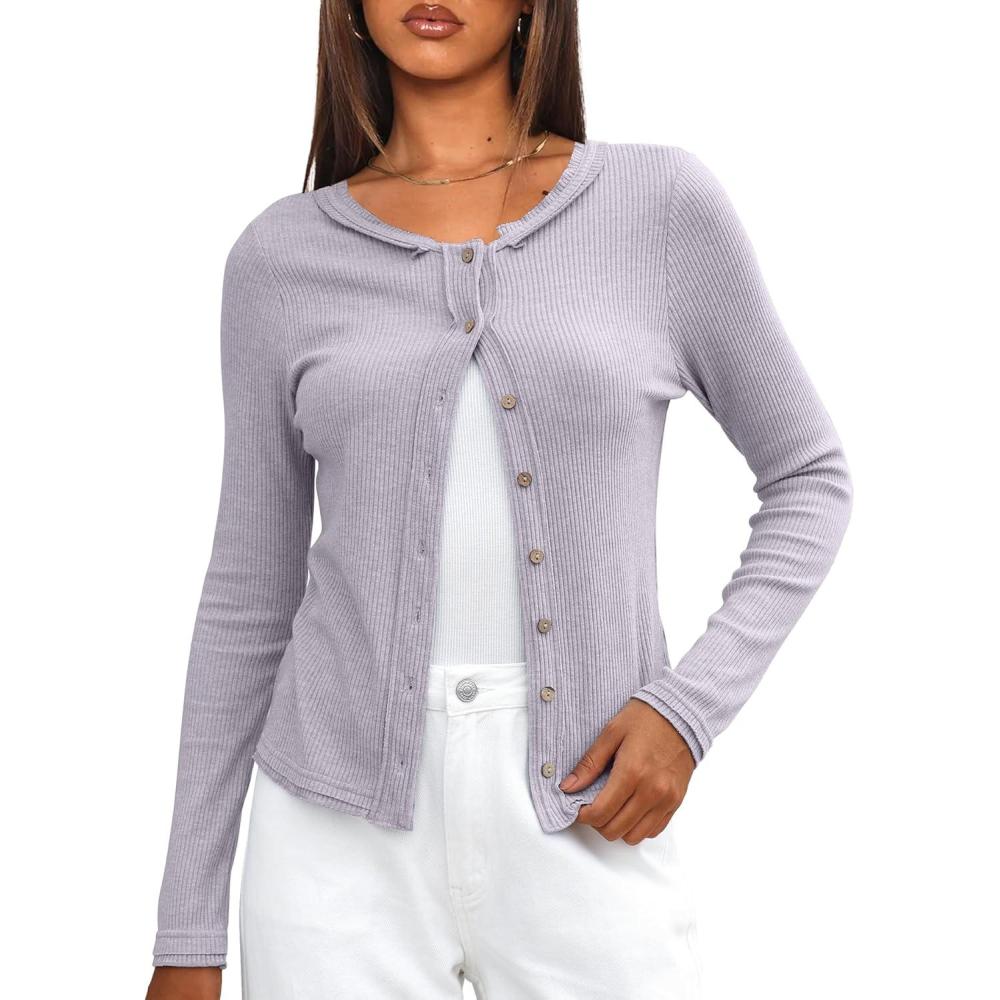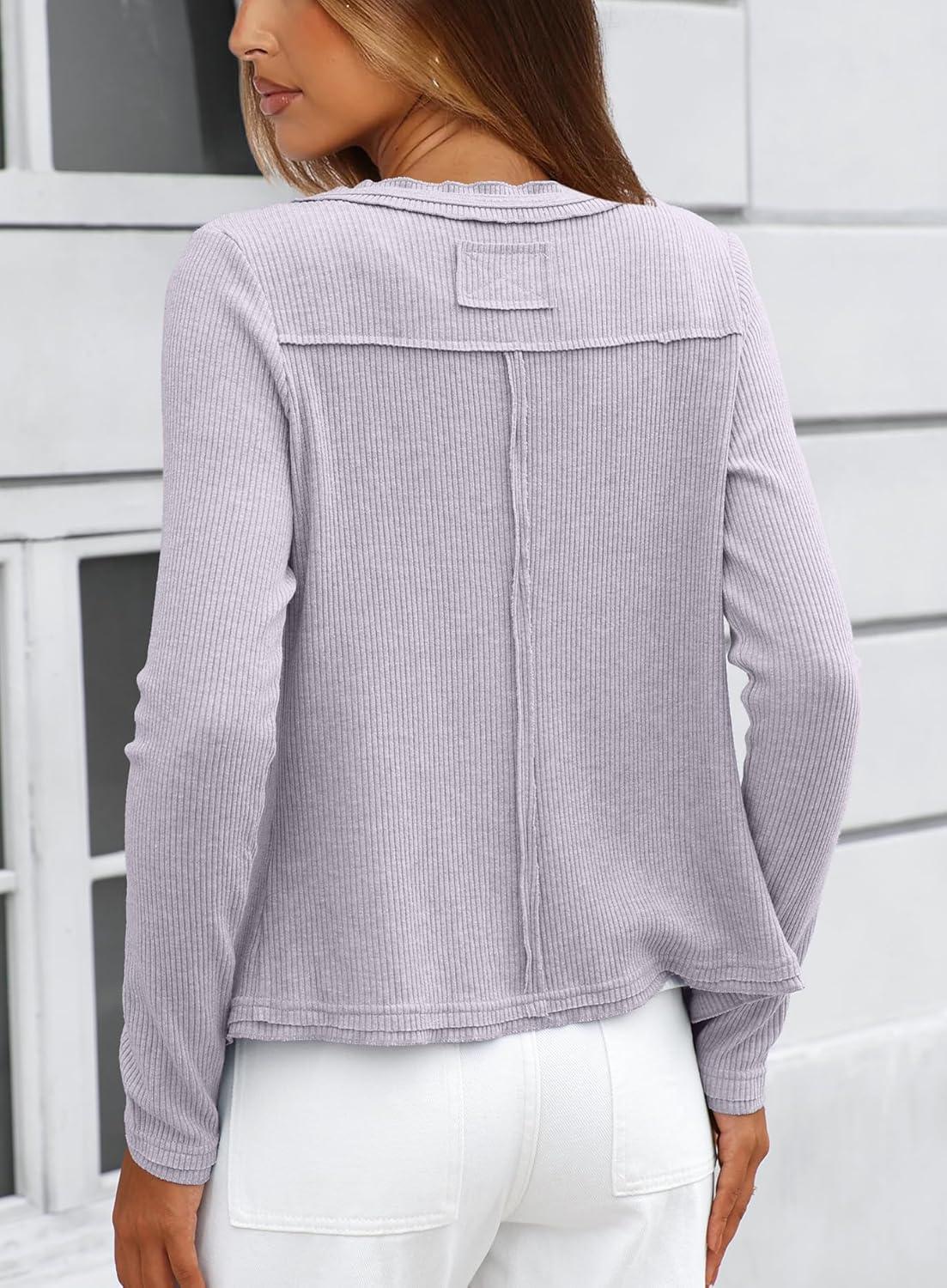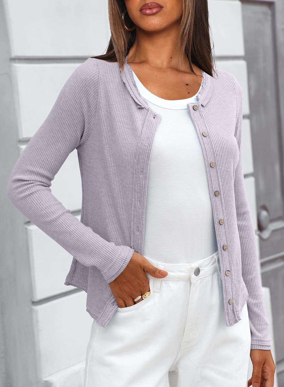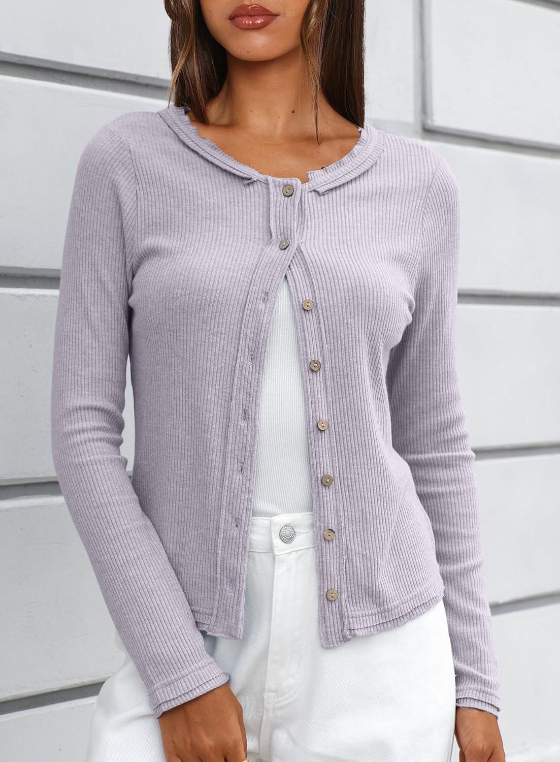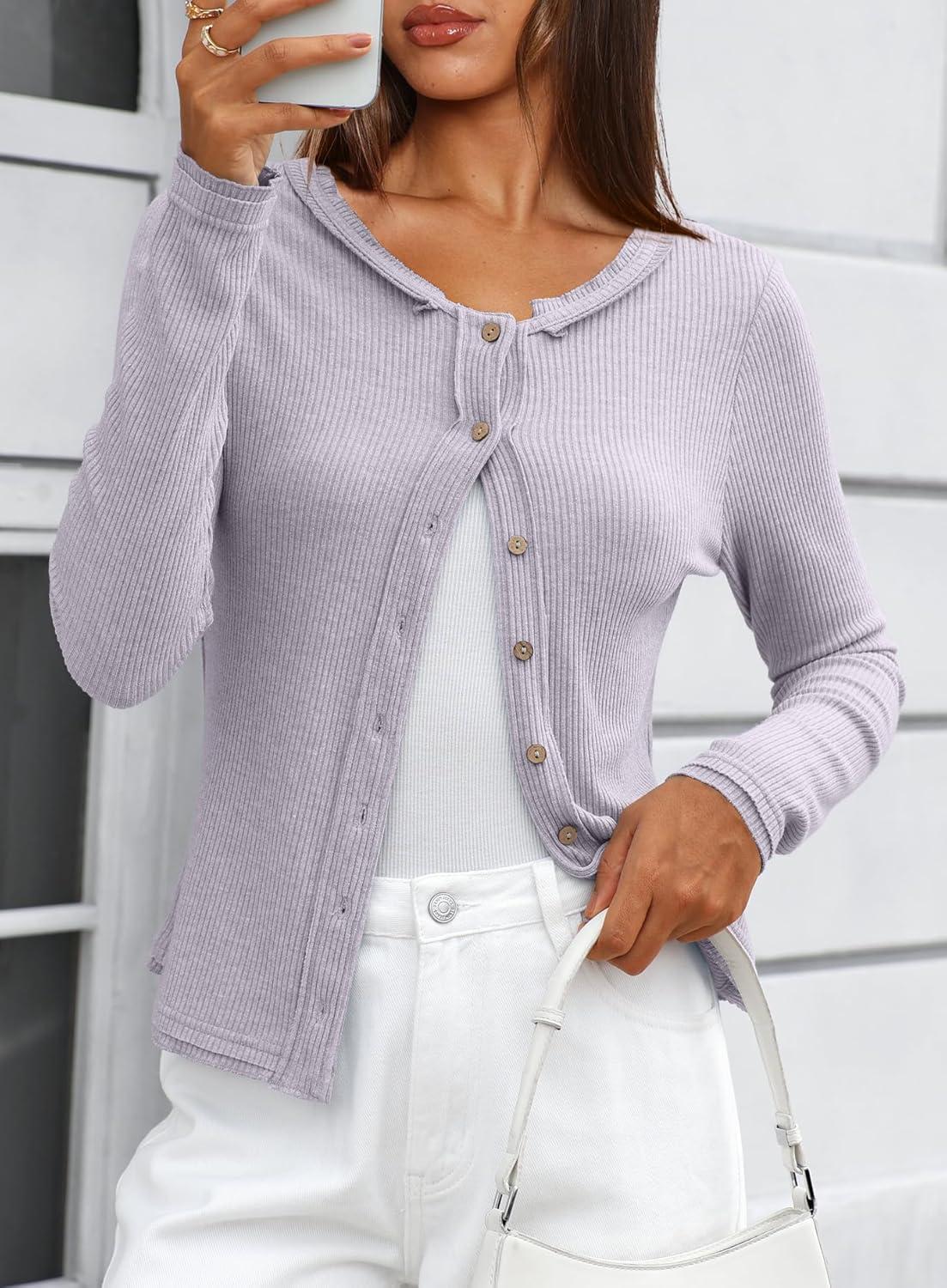 Darong Women Button Down Shirt Fall Long Sleeve Ribbed Knit Top Lightweight Cardigan Cute Going Out Sweater(Light Purple)