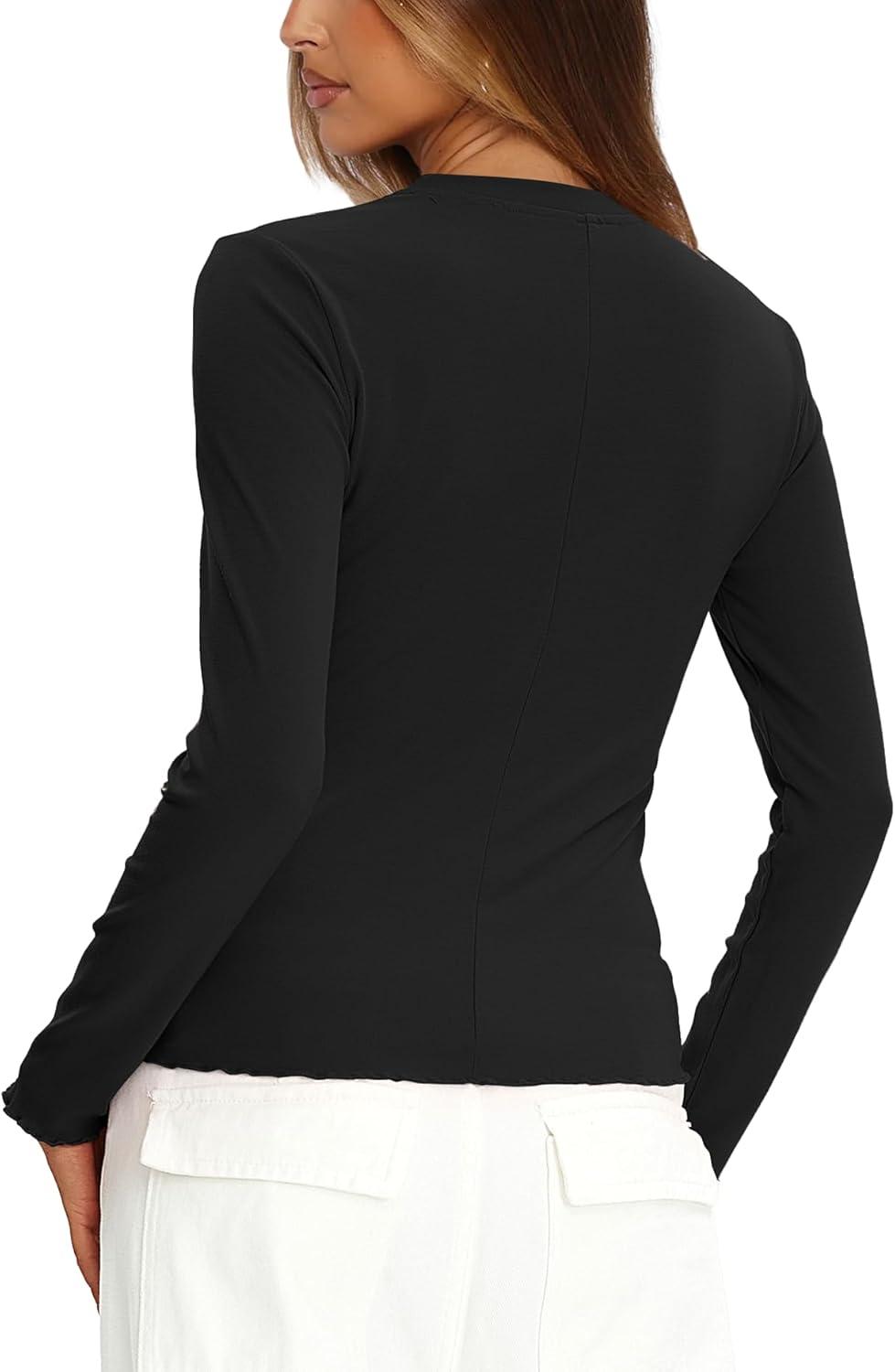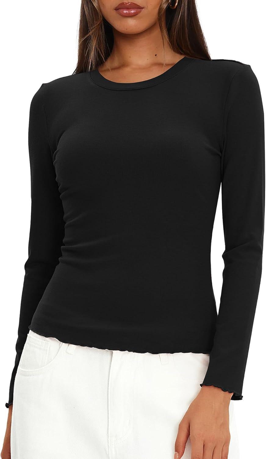 Darong Women Long Sleeve Shirts Slim Fit Tops Basic Tee 2025 Cute Lettuce Trim Undershirt Going Out Layer Clothes(Black)