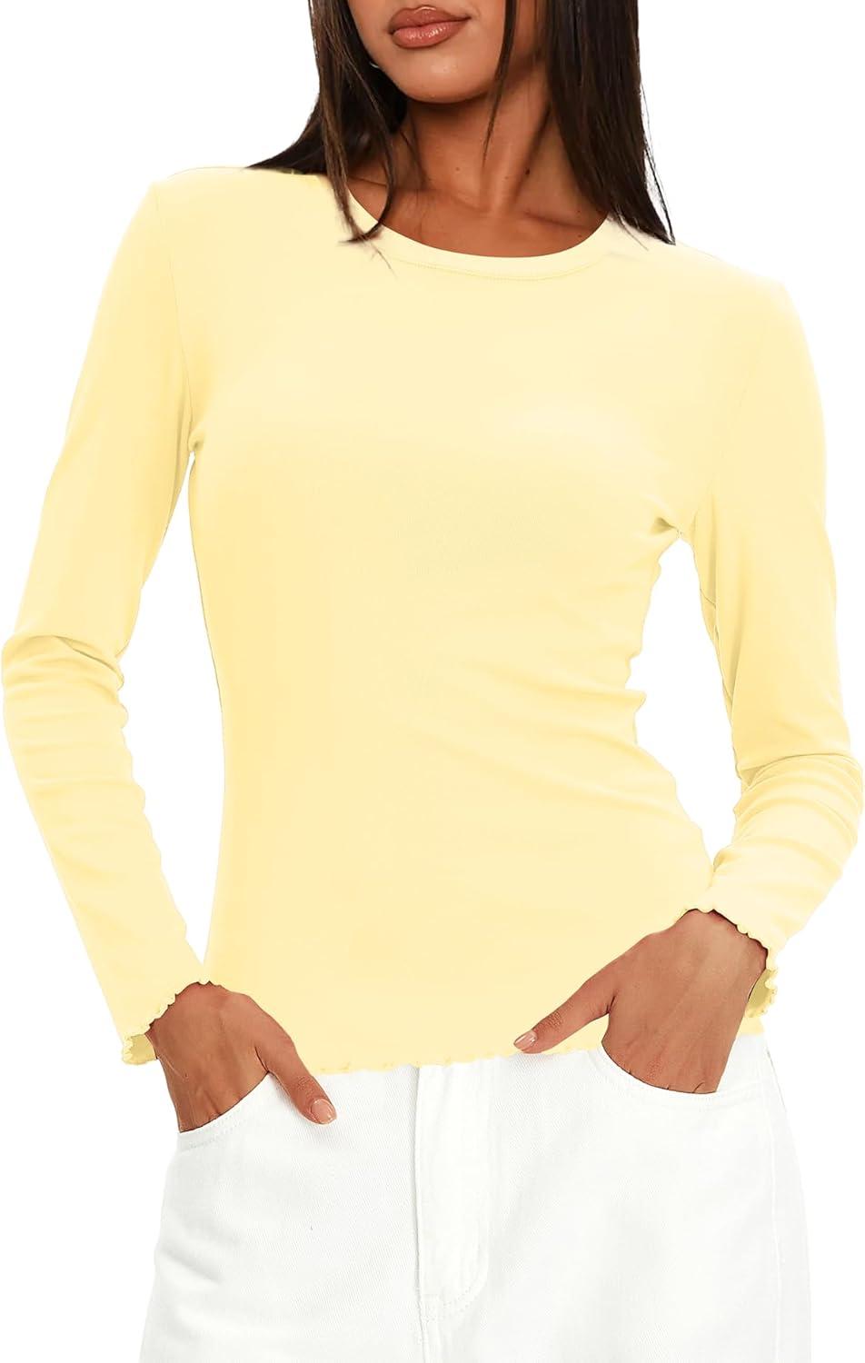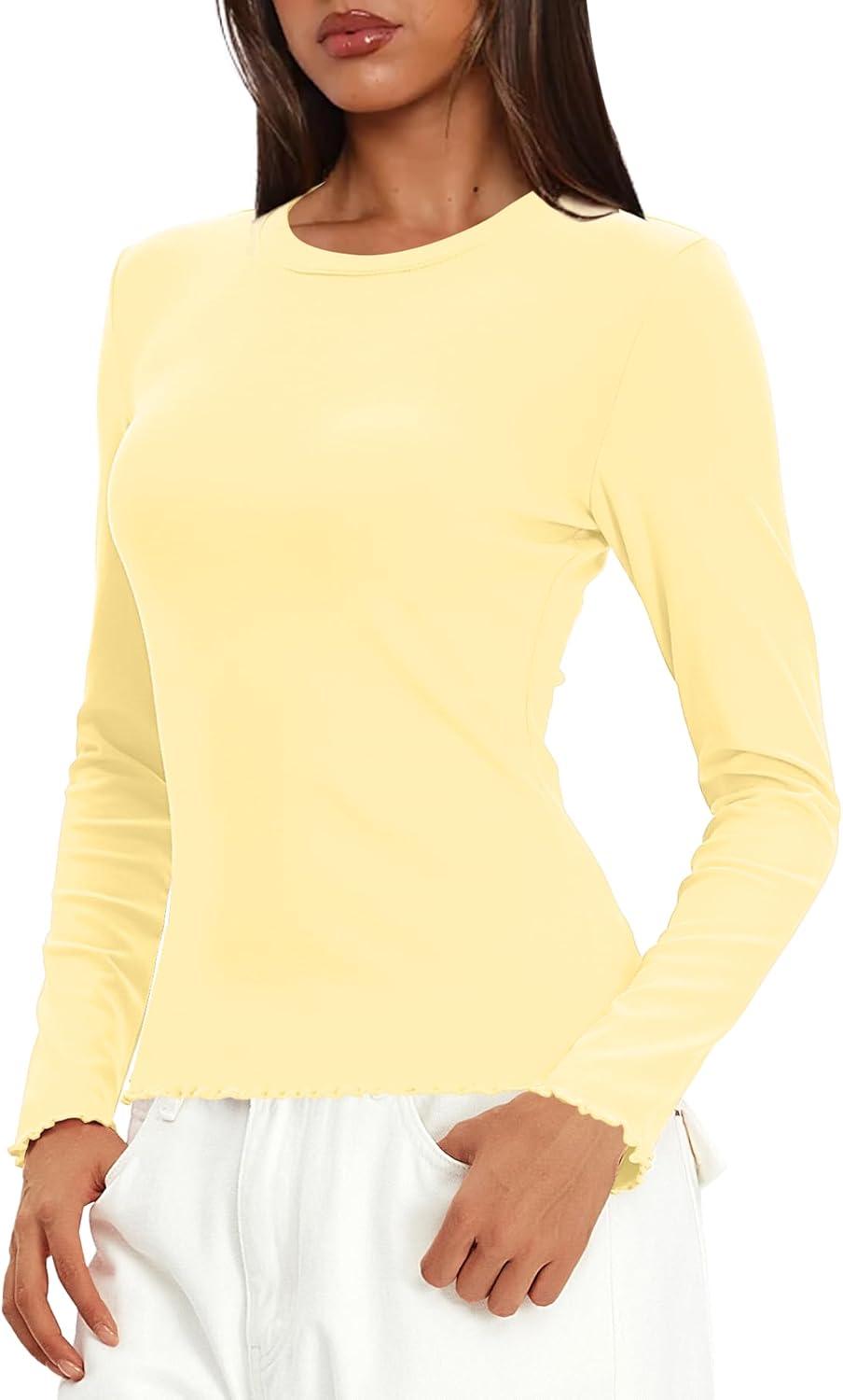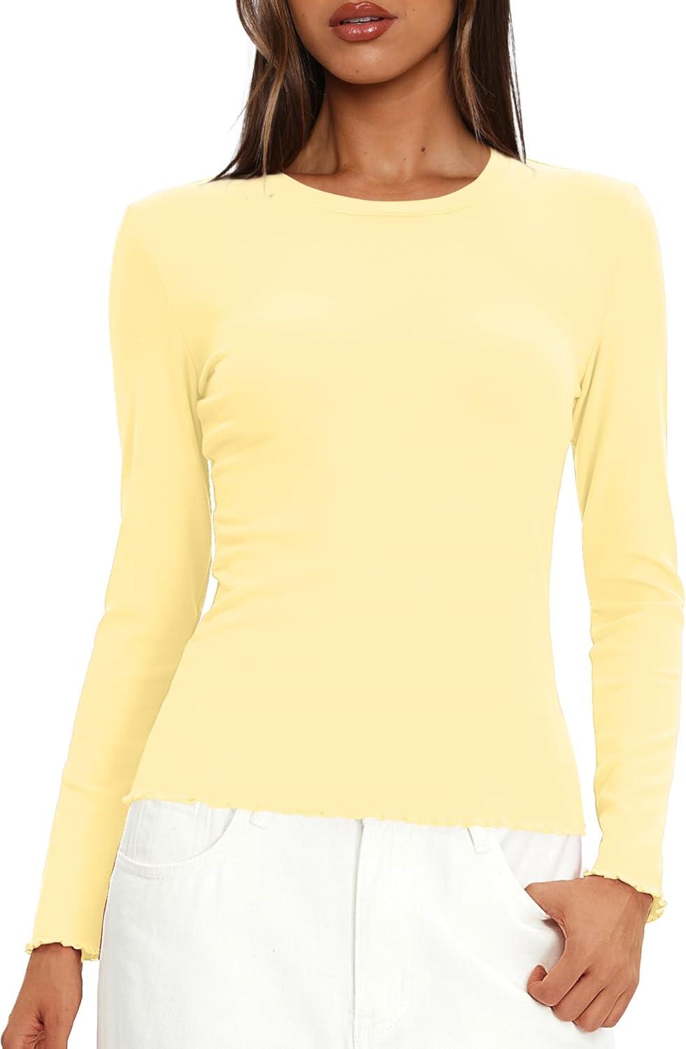 Darong Women Long Sleeve Shirts Slim Fit Tops Basic Tee 2025 Cute Lettuce Trim Undershirt Going Out Layer Clothes(Light Yellow)