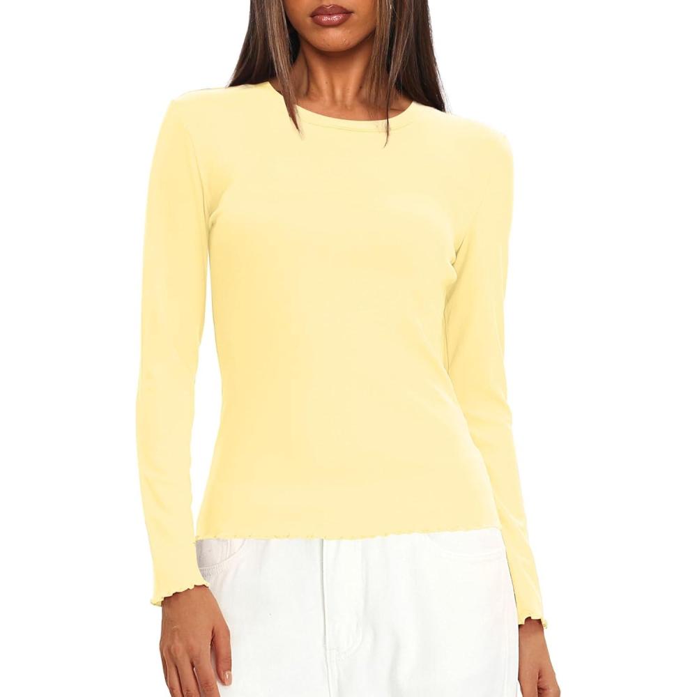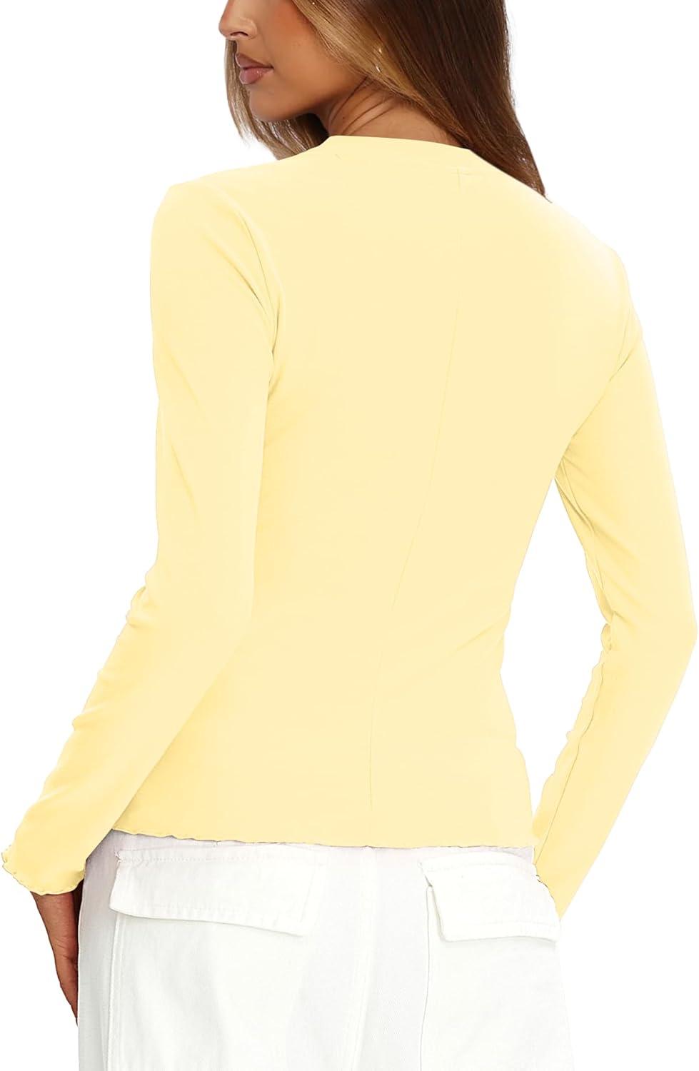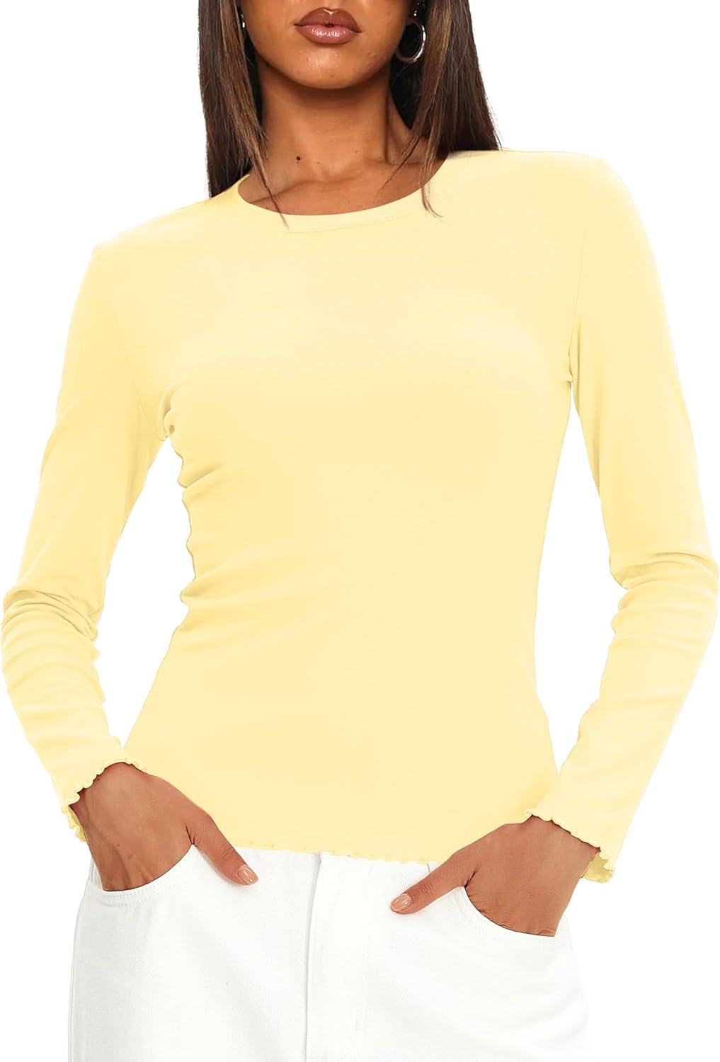 Darong Women Long Sleeve Shirts Slim Fit Tops Basic Tee 2025 Cute Lettuce Trim Undershirt Going Out Layer Clothes(Light Yellow)