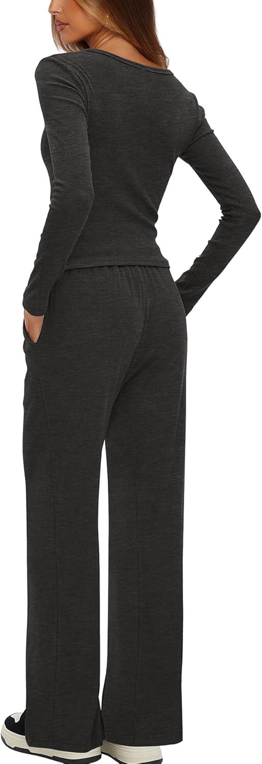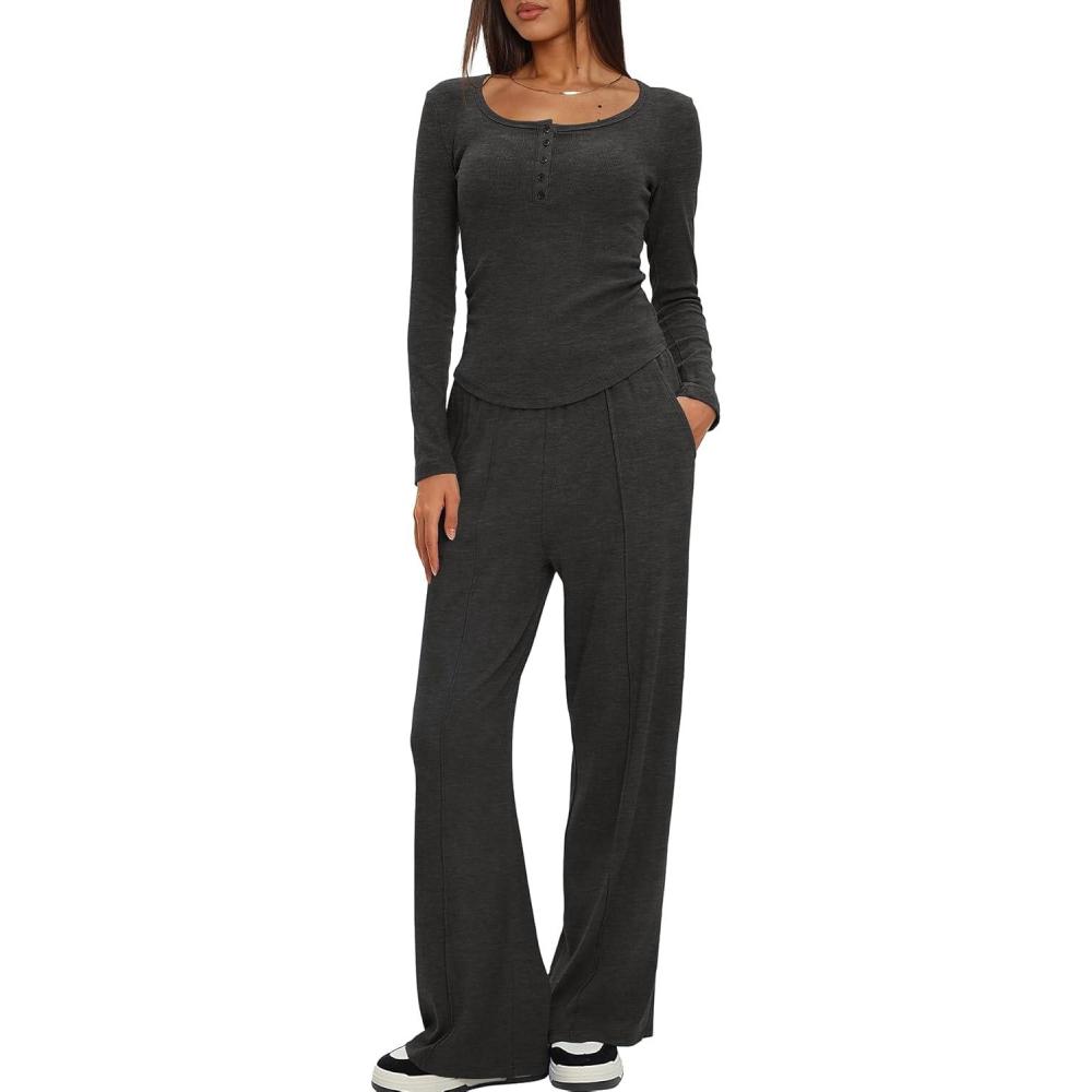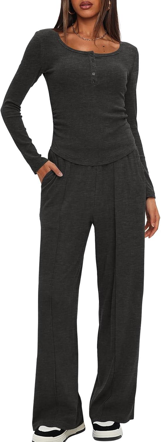 Darong Women's Fall Trendy 2 Piece Outfits Lounge Sets Long Sleeve Top Henley Shirts Wide Leg Pants Travel Clothes(Black)