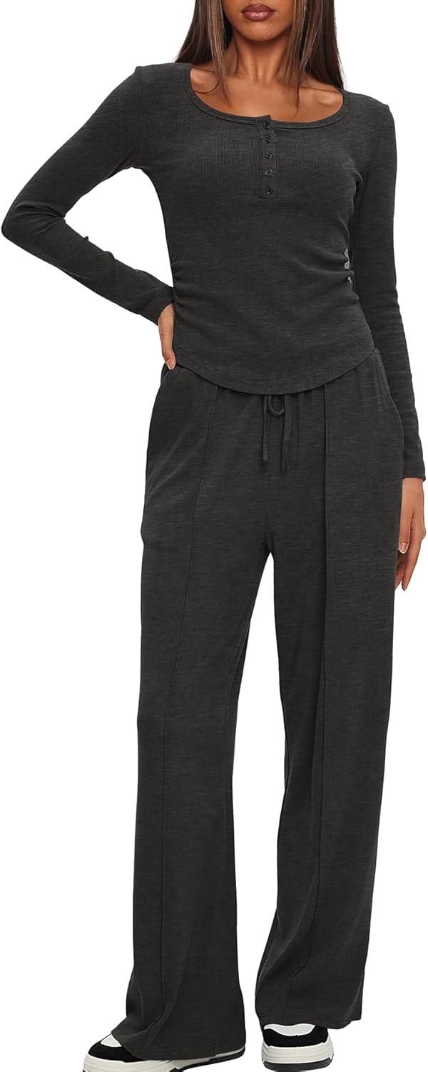 imageDarong Womens Fall Trendy 2 Piece Outfits Lounge Sets Long Sleeve Top Henley Shirts Wide Leg Pants Travel ClothesBlack