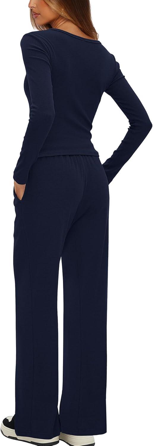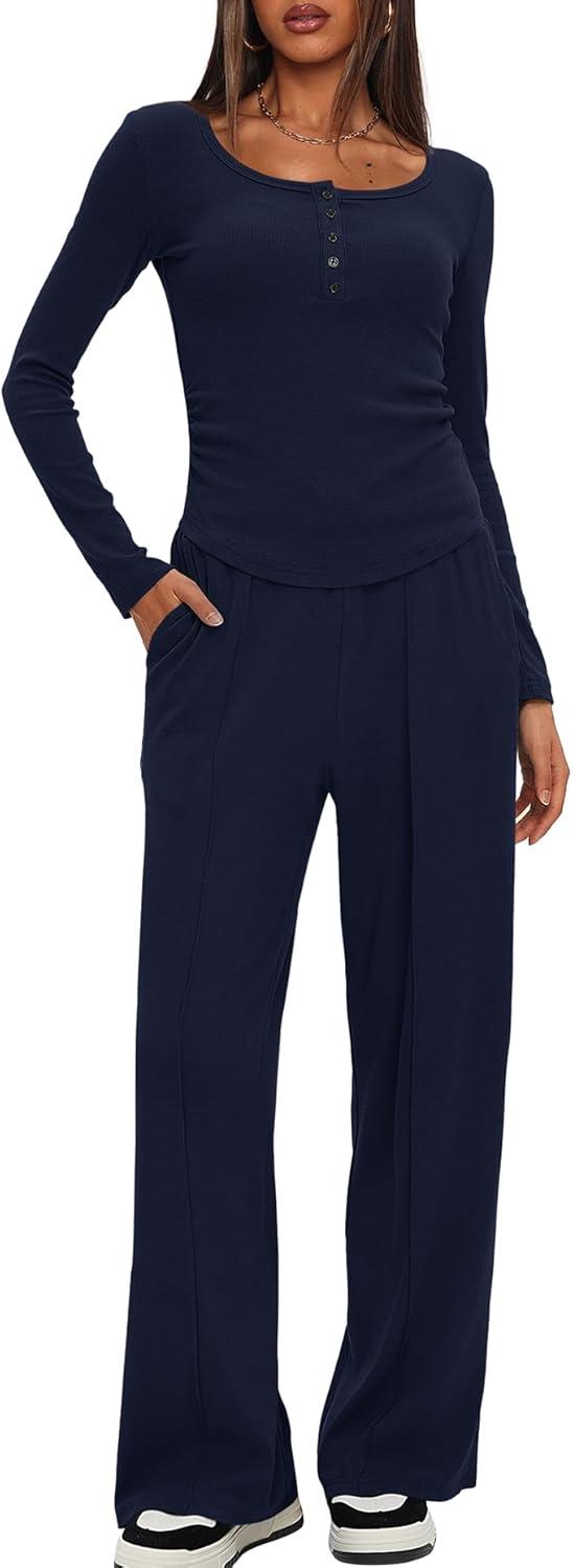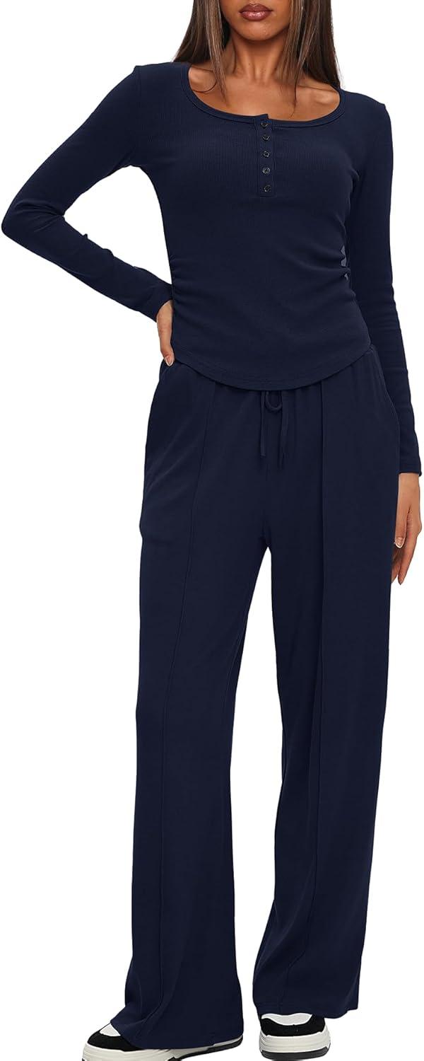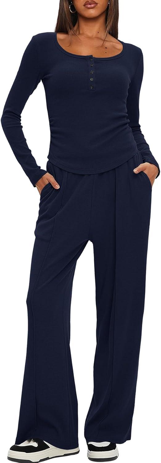 Darong Women's Fall Trendy 2 Piece Outfits Lounge Sets Long Sleeve Top Henley Shirts Wide Leg Pants Travel Clothes(Dark Blue)