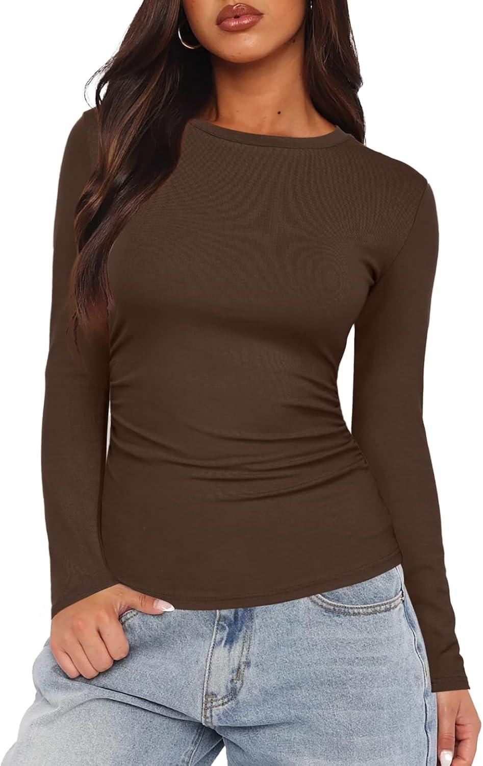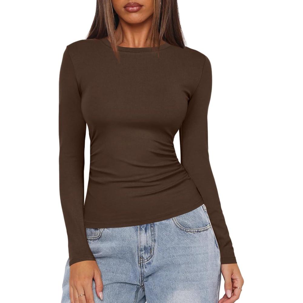 Darong Women's Long Sleeve Crew Neck Shirts Fall Basic Casual Ruched Side Slim Fit T Shirts Tee Tops(Coffee)