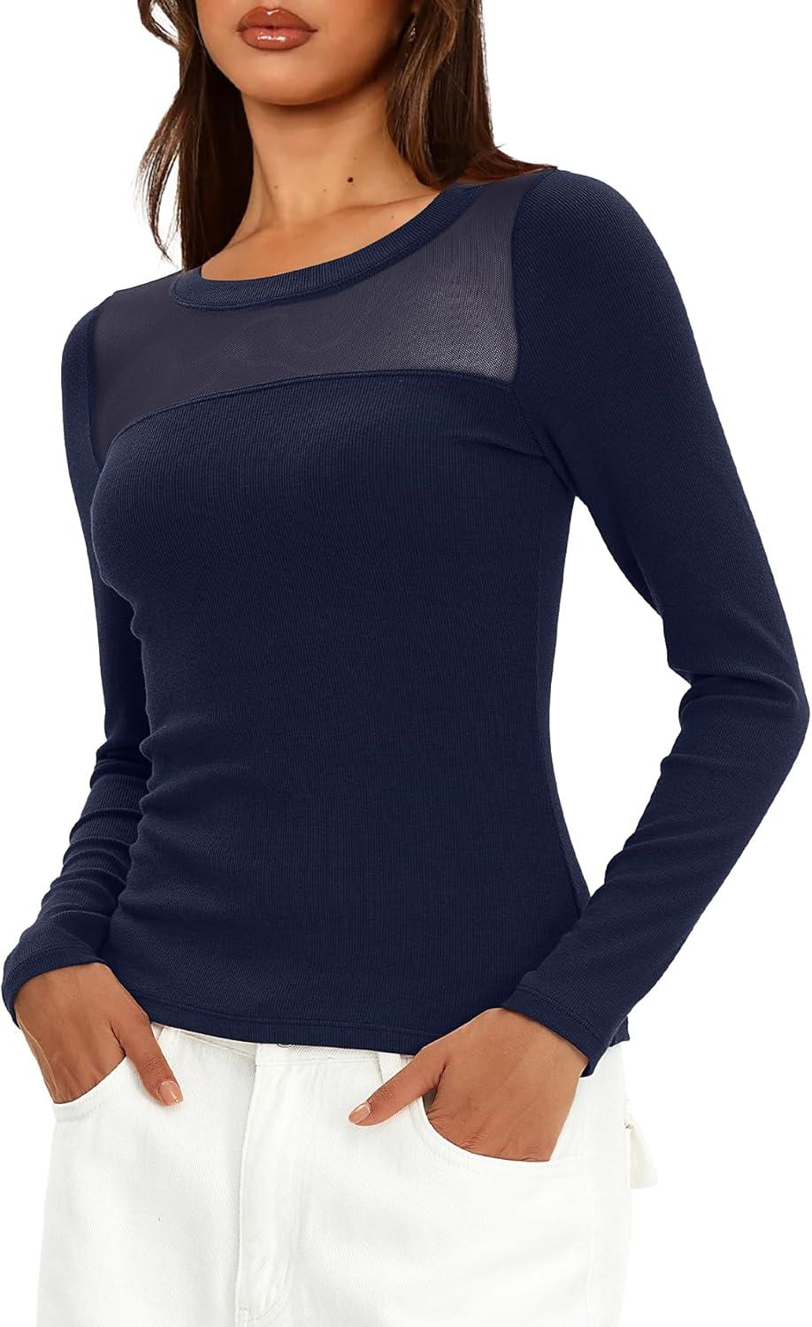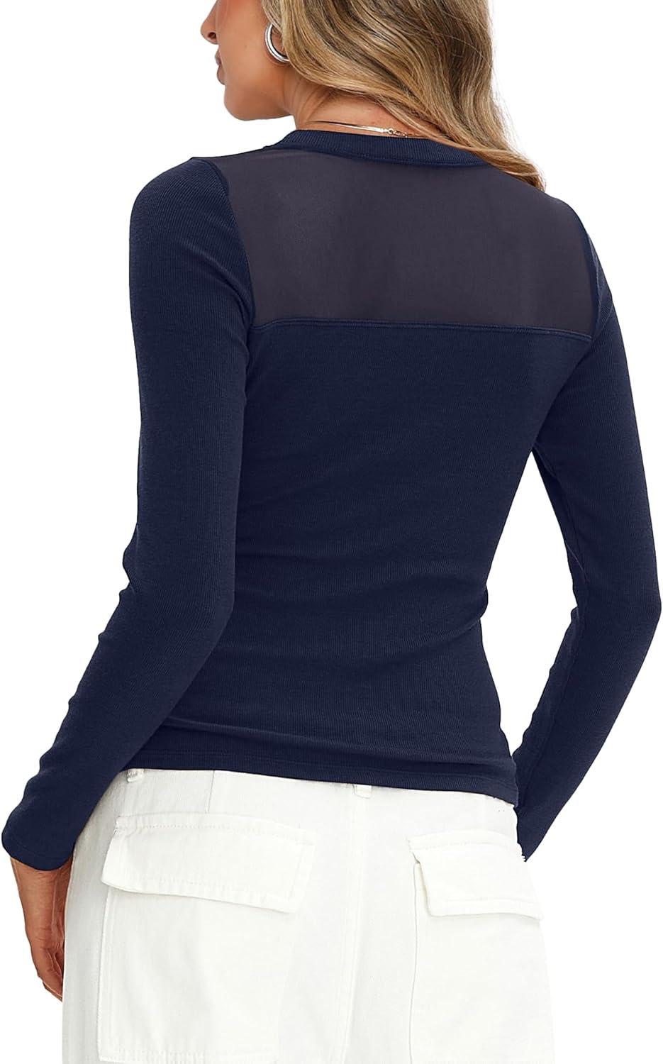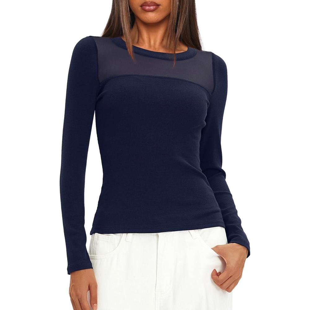 Darong Womens Mesh Sheer Long Sleeve Top Crew Neck Slim Fit Shirts Sexy Casual Going Out Blouses(Dark Blue)