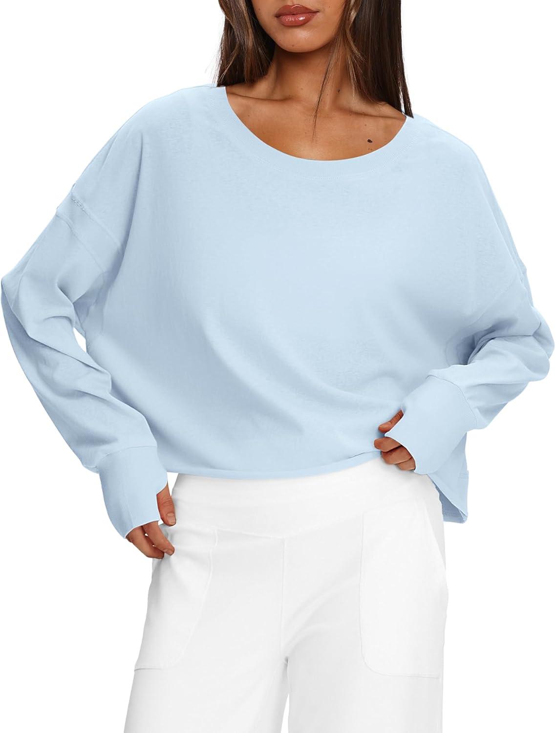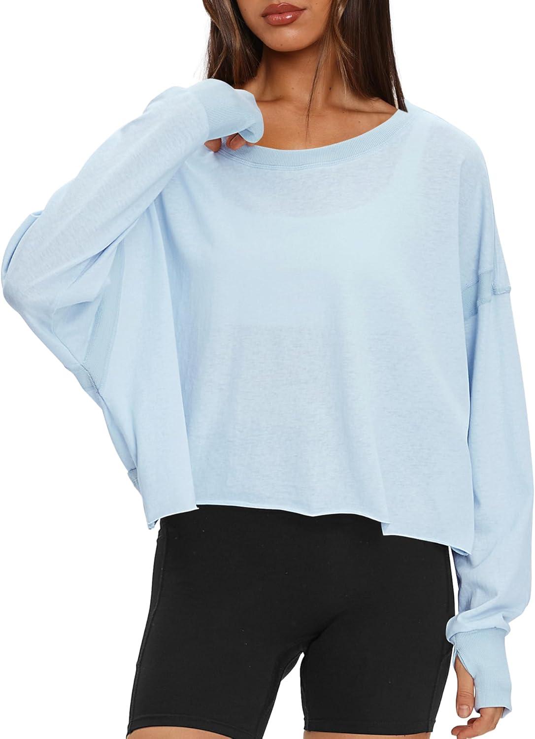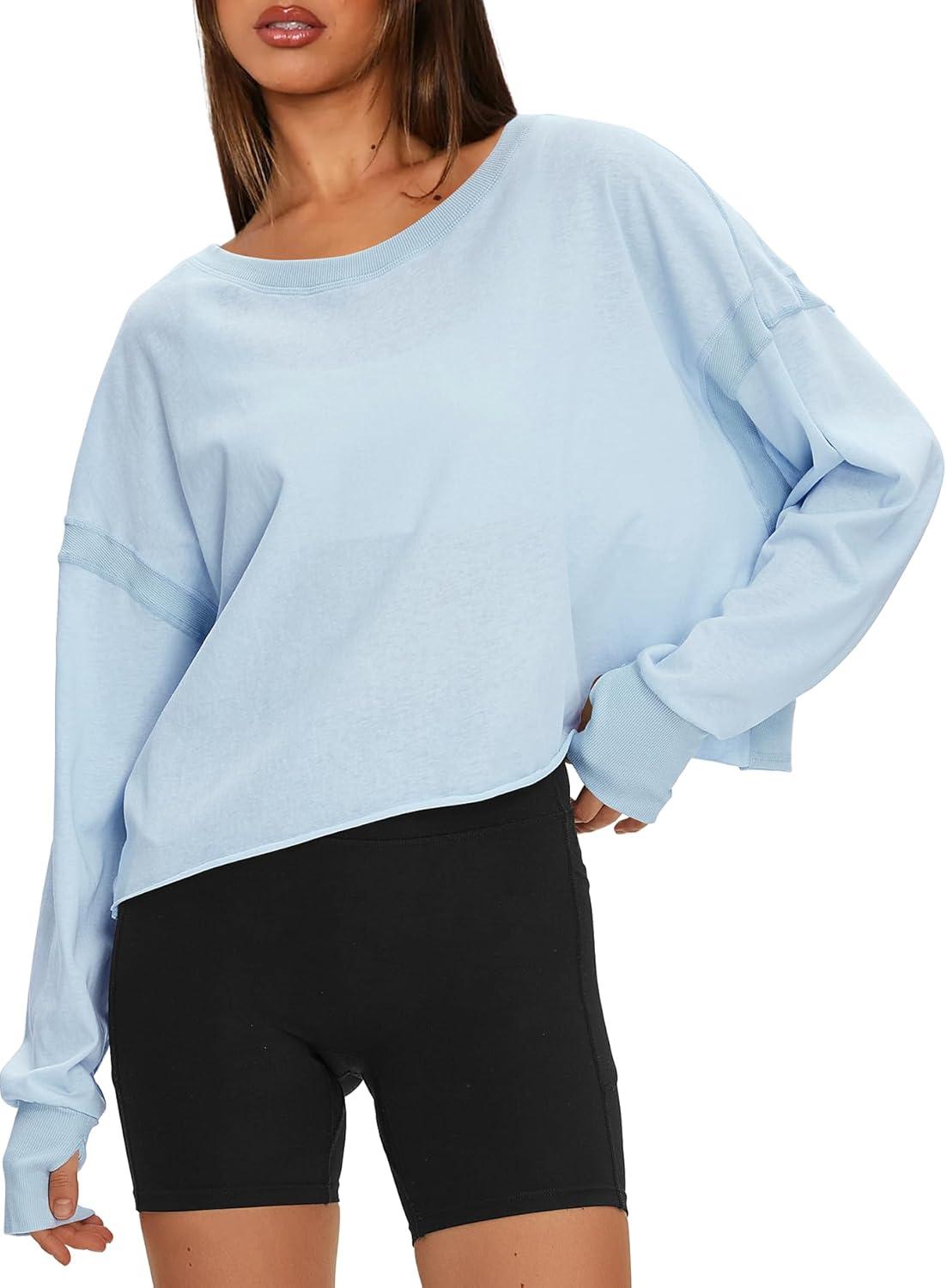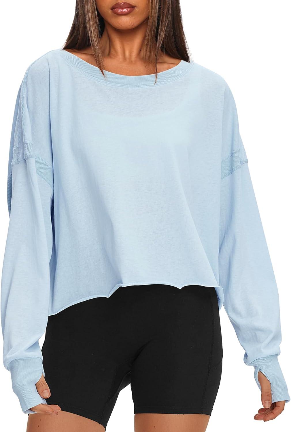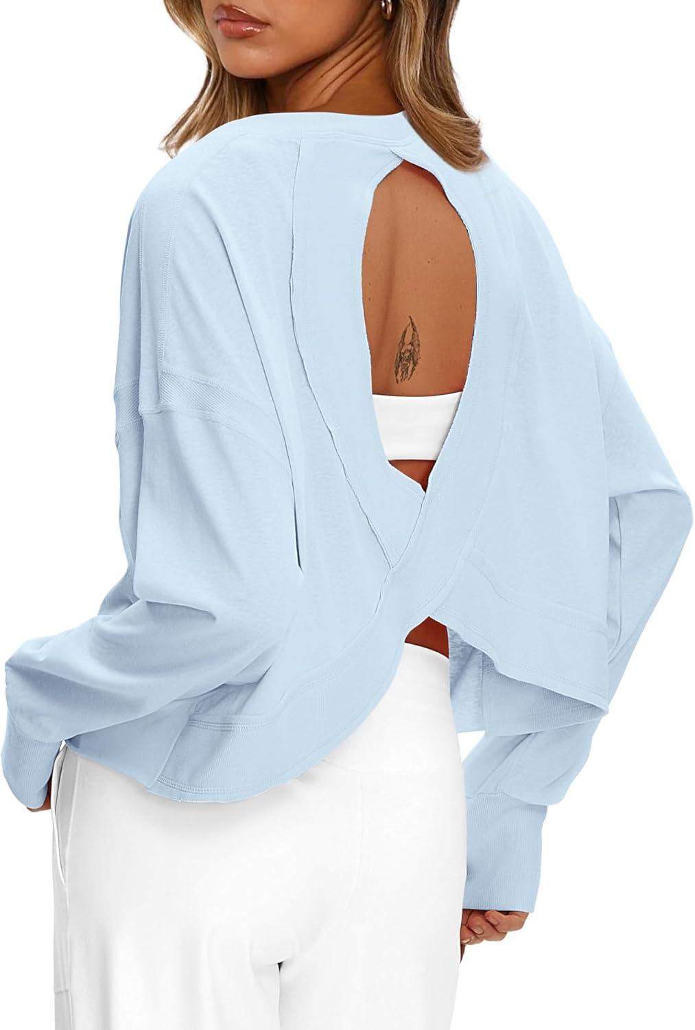 Darong Women's Open Back Workout Top Oversized Athletic Shirt Long Sleeve Crop Top with Thumb Holes(Light Blue)
