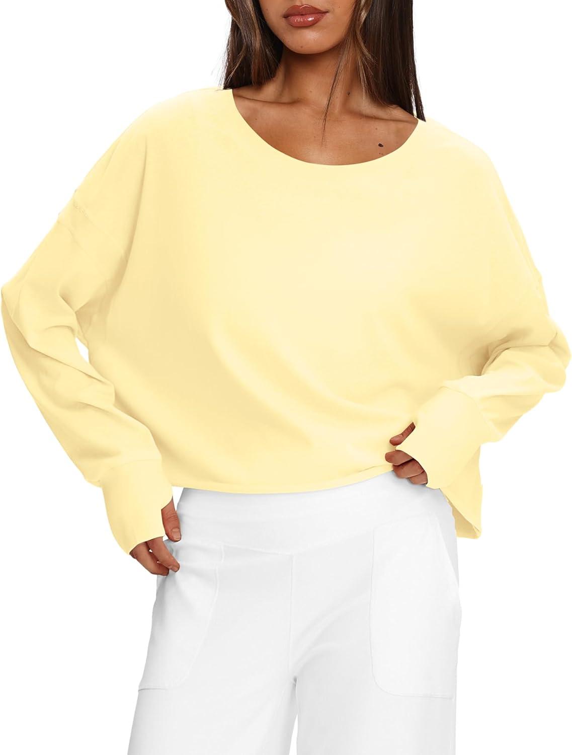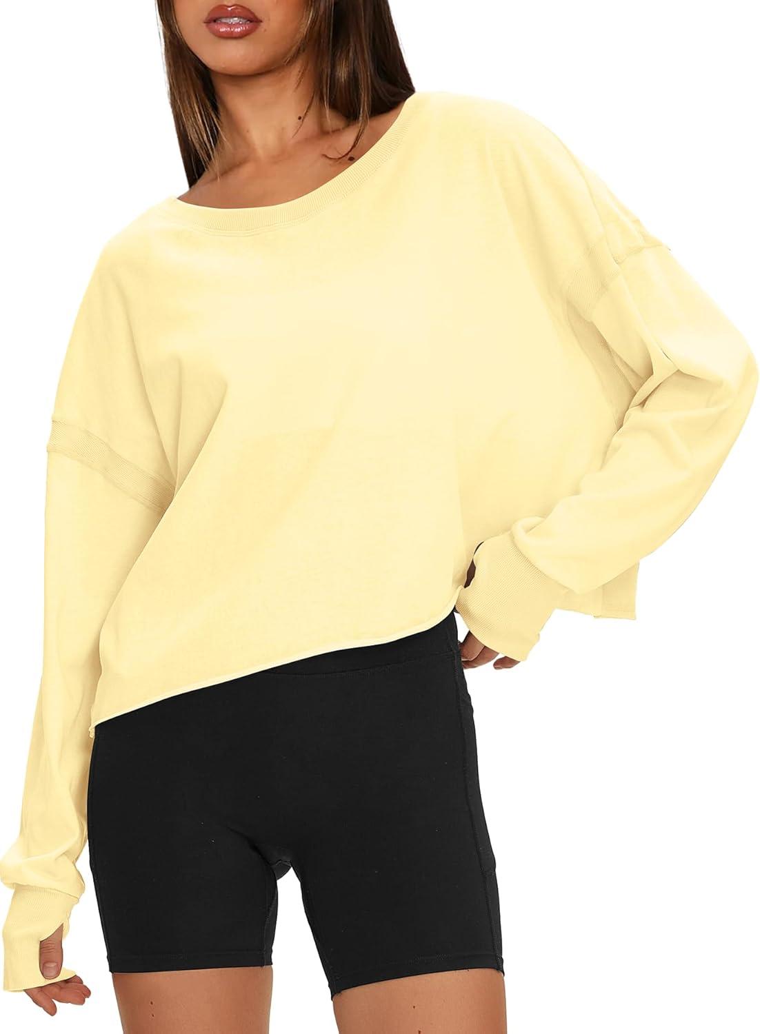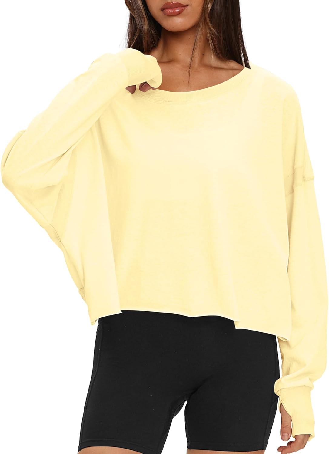 Darong Women’s Open Back Workout Top Oversized Athletic Shirt Long Sleeve Crop Top with Thumb Holes(Light Yellow)