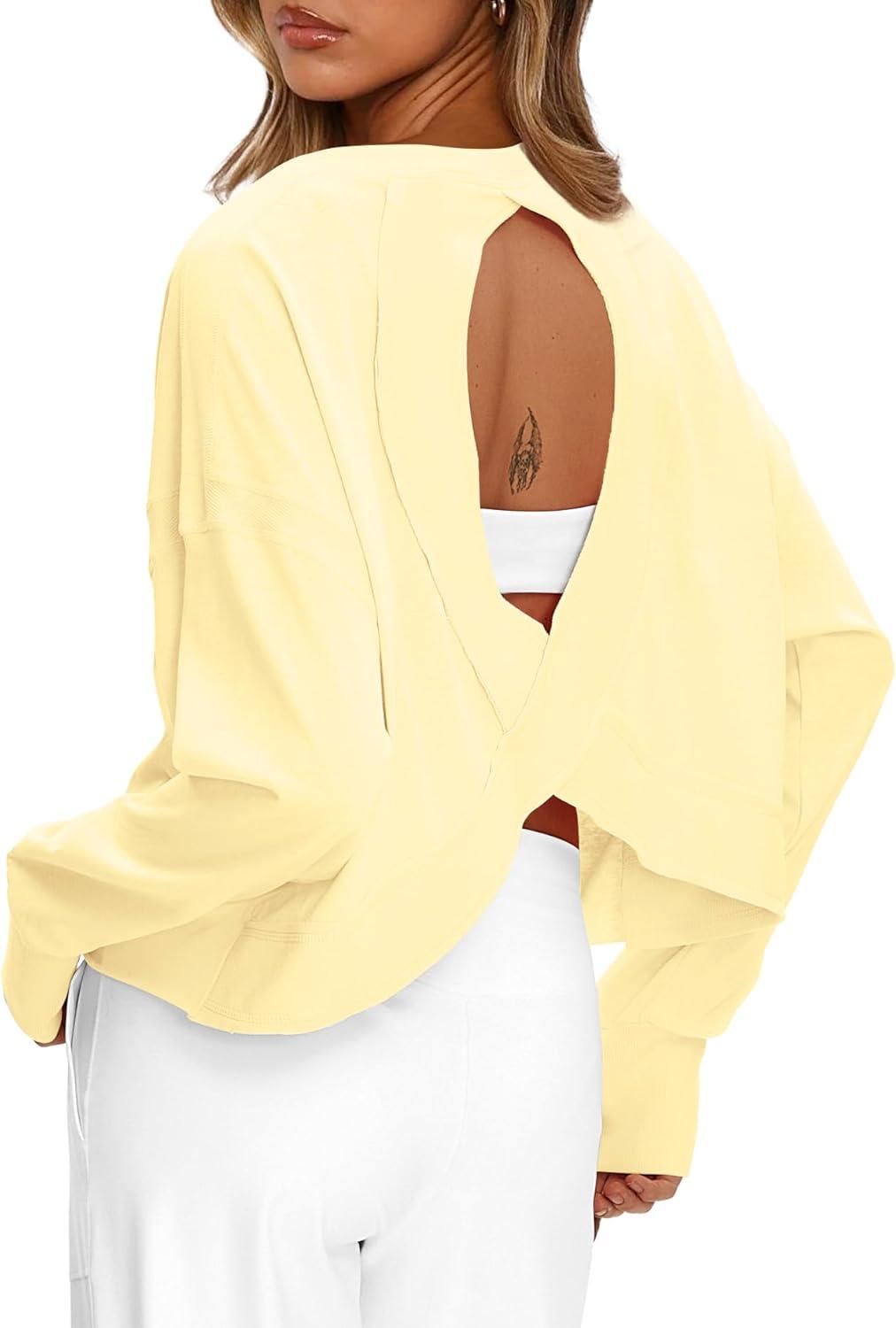 Darong Women's Open Back Workout Top Oversized Athletic Shirt Long Sleeve Crop Top with Thumb Holes(Light Yellow)