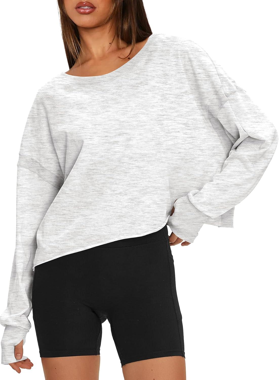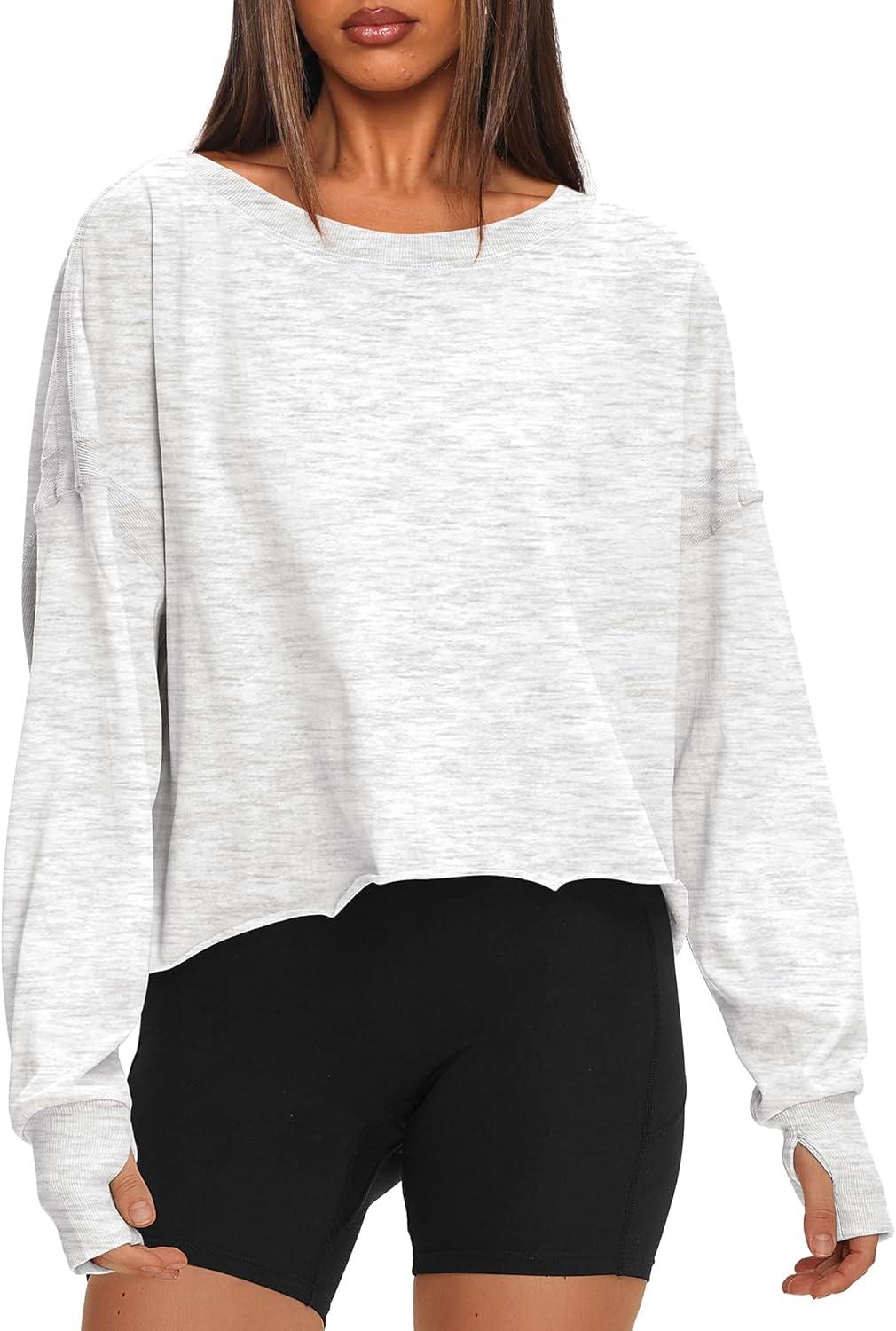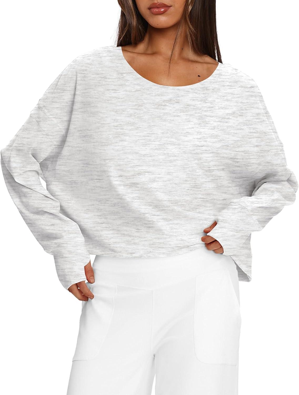 Darong Women’s Open Back Workout Top Oversized Athletic Shirt Long Sleeve Crop Top with Thumb Holes(White Grey)