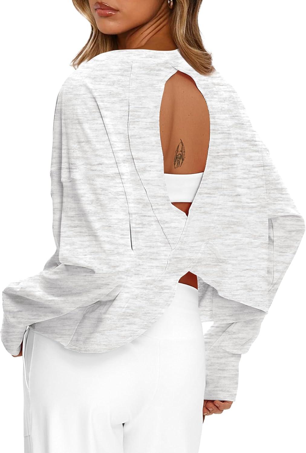 imageDarong Womens Open Back Workout Top Oversized Athletic Shirt Long Sleeve Crop Top with Thumb HolesWhite Grey