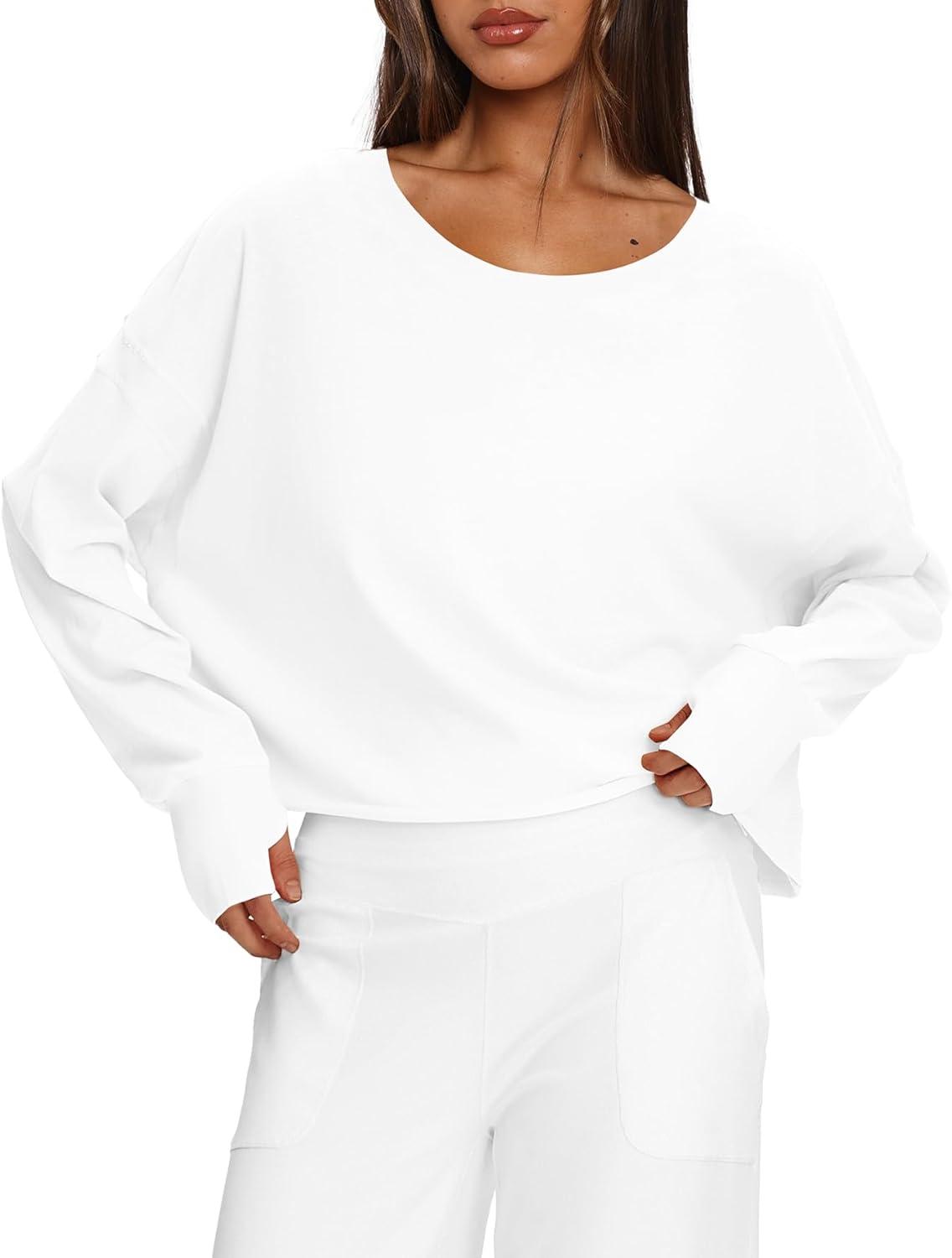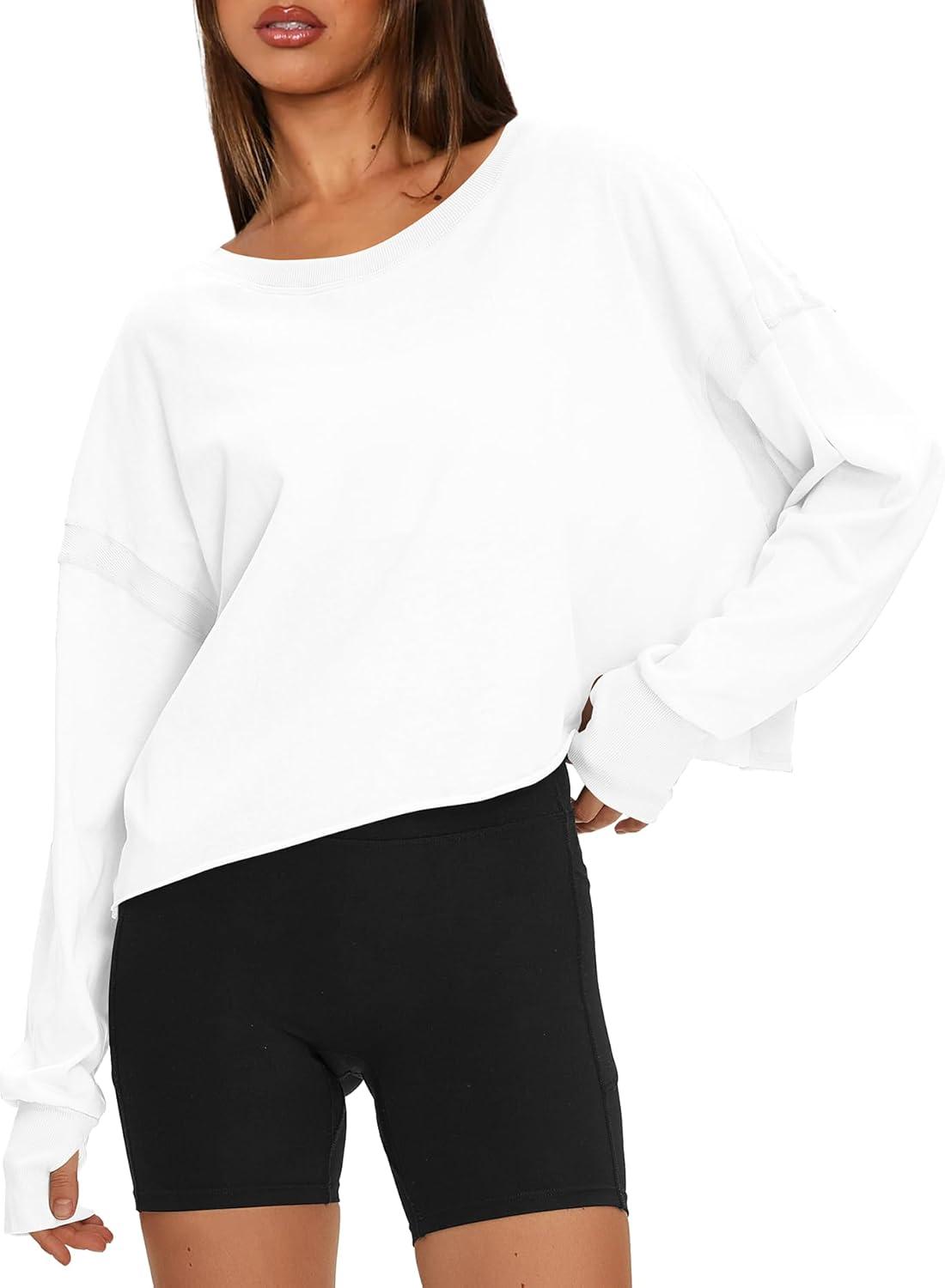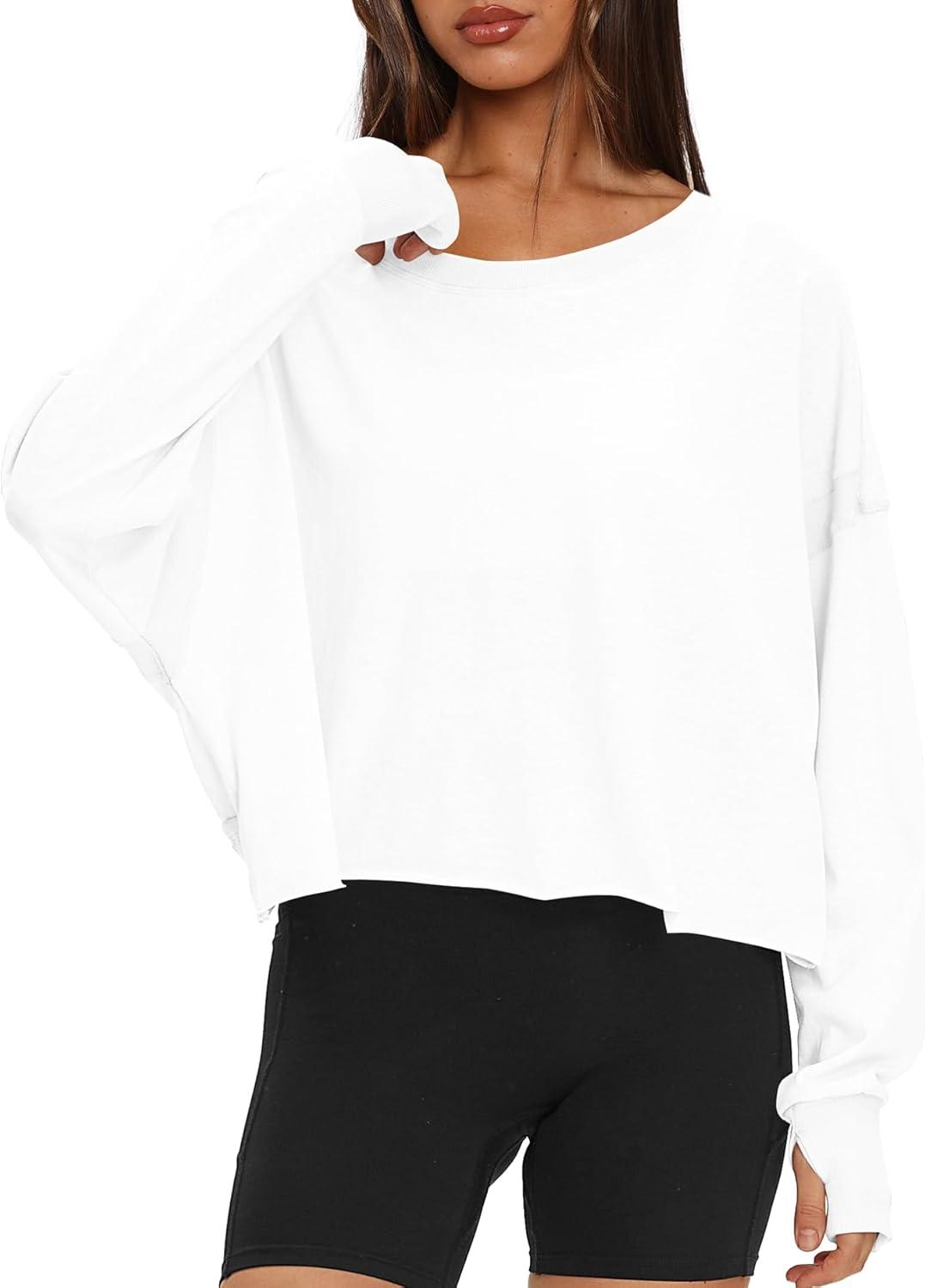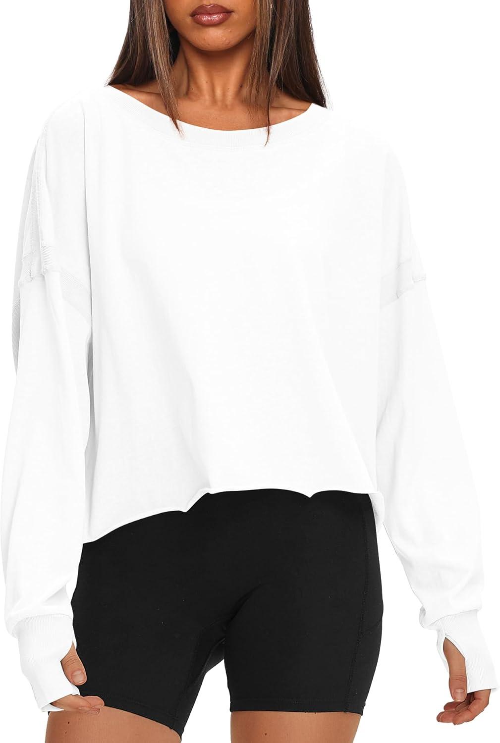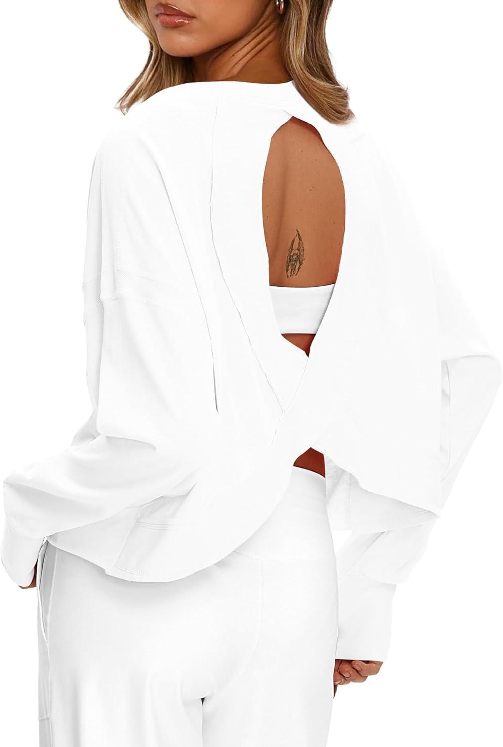 Darong Women’s Open Back Workout Top Oversized Athletic Shirt Long Sleeve Crop Top with Thumb Holes(White)