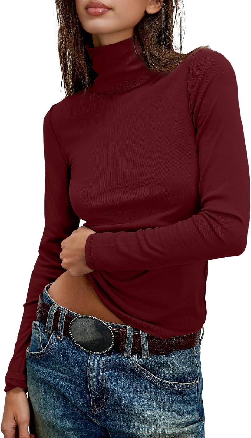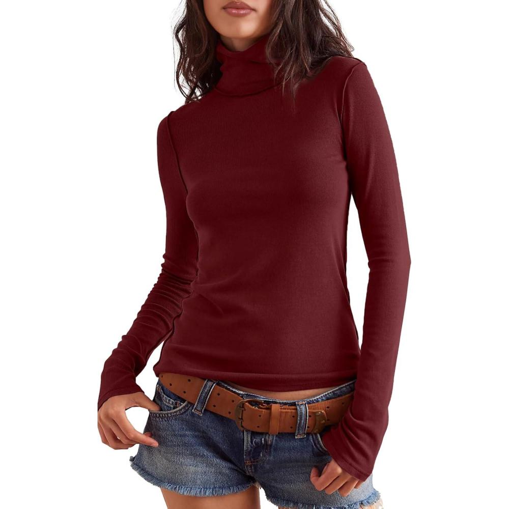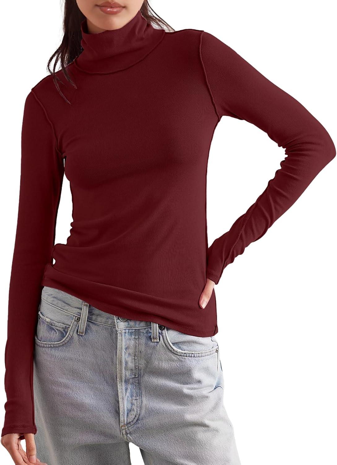 Darong Womens Striped Turtleneck Shirt Long Sleeve Undershirts Ribbed Slim Fit Top Fitted Basic Tees(Red)
