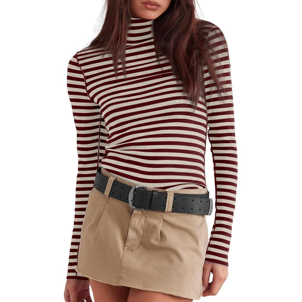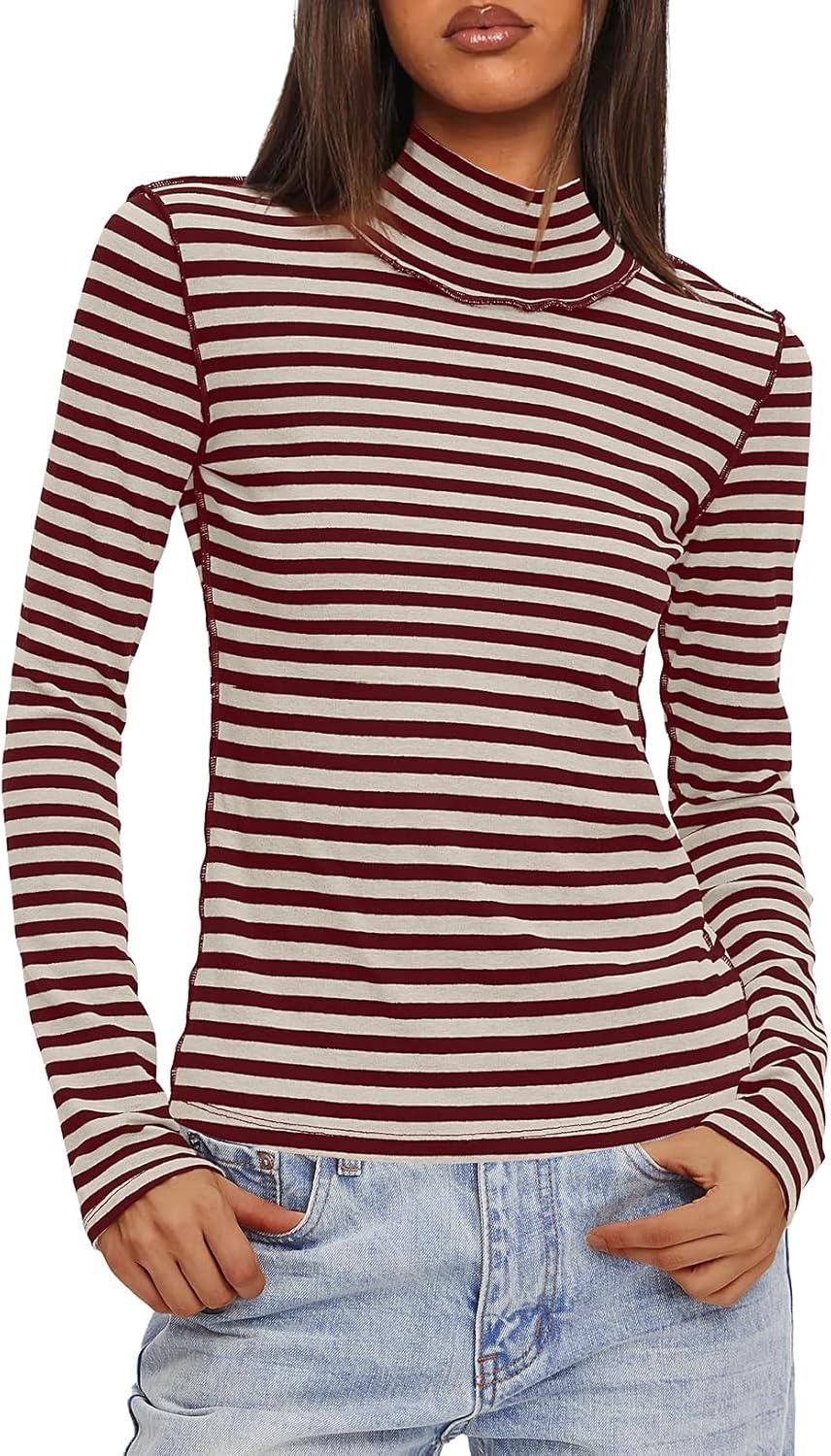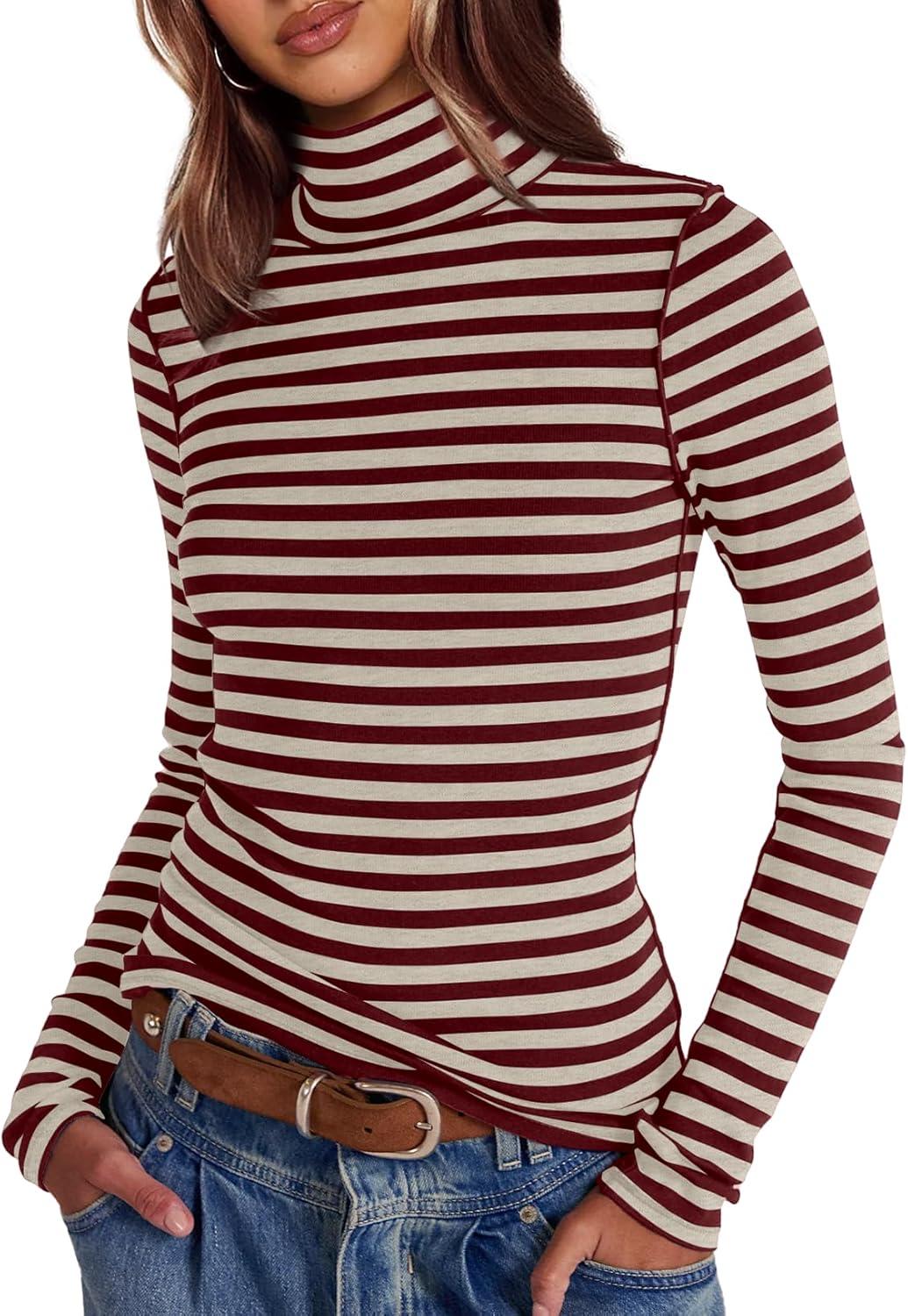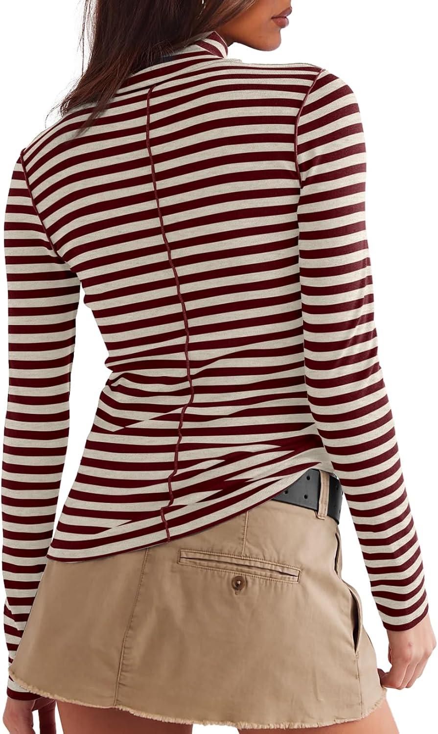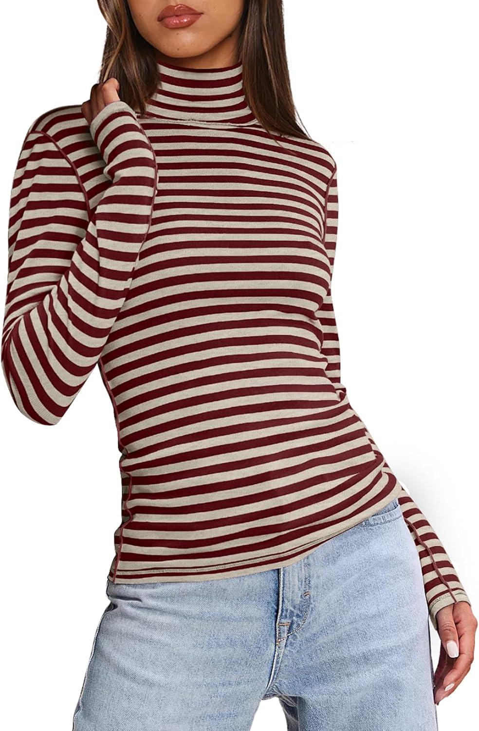 Darong Womens Striped Turtleneck Shirt Long Sleeve Undershirts Ribbed Slim Fit Top Fitted Basic Tees(Wine Red Stripe)